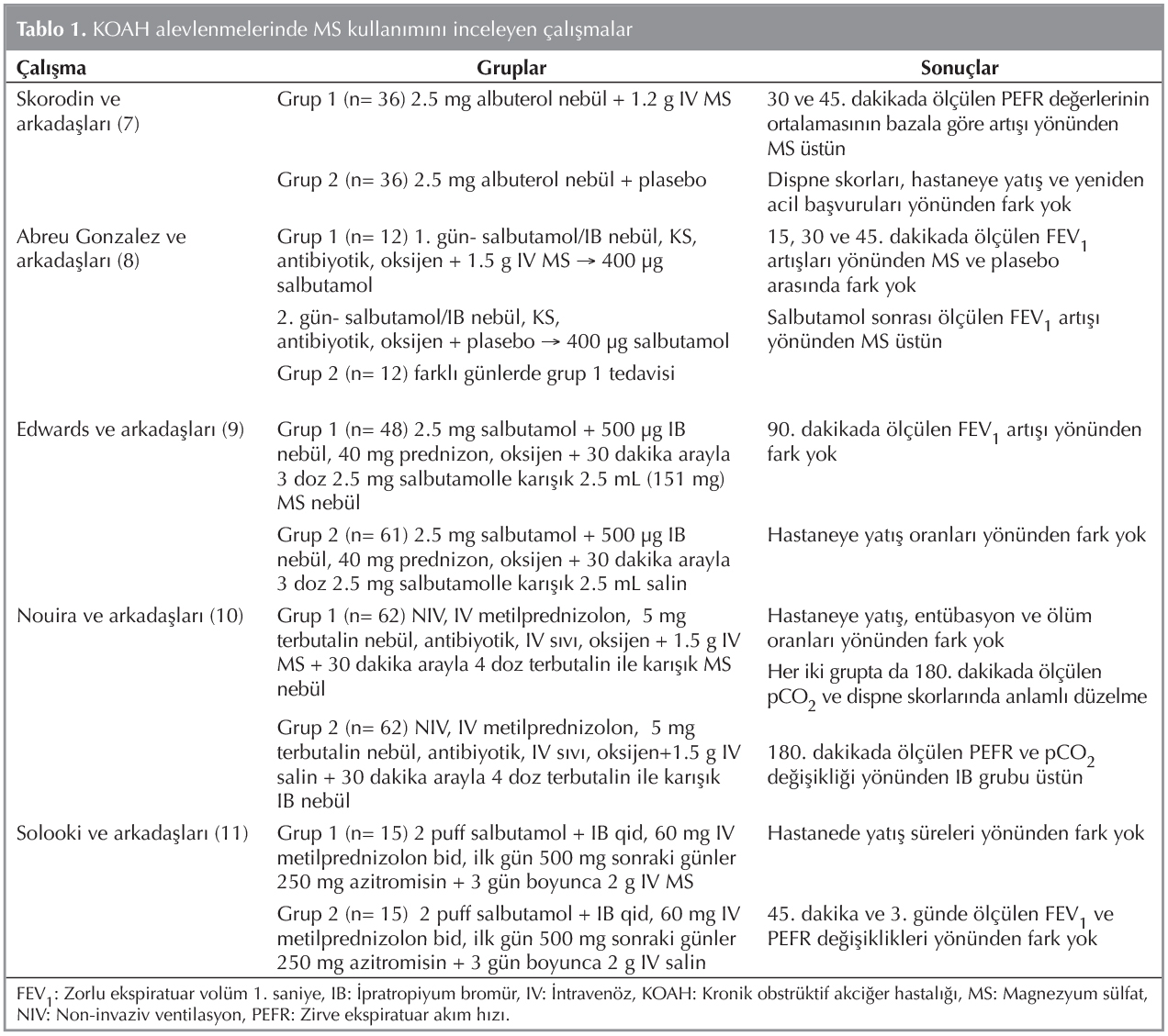 G?n?m?ze değin literat?rde KOAH alevlenmelerinde IV, neb?l veya her iki yolla birlikte uygulanan MS'nin etkinliğini değerlendiren yalnızca beş plasebo kontroll? ?alışma bulunmaktadır (7,8,9,10,11). Bu ?alışmaların ?? tanesinde, MS tedavisinin PEFR ve/veya FEV1 ile ?l??len hava yolu obstr?ksiyonu değişikliği y?n?nden standart medikal tedaviye ek katkı sağlamadığı saptanmıştır (9,10,11). Yalnızca bir ?alışmada 1.2 g IV MS veya plasebo inf?zyonundan? sonra? 30 ve 45. dakikada ?l??len PEFR değerlerinin ortalamasının bazala g?re değişikliği y?n?nden MS grubunda anlamlı ?st?nl?k tespit edilmiştir (7). Diğer bir ?alışmada ise, 1.5 g IV MS inf?zyondan sonra 15, 30 ve 45. dakikalarda ?l??len FEV1 değişiklikleri y?n?nden plaseboya ?st?nl?k saptanmazken, MS veya plasebo sonrasında salbutamol uygulaması yapıldığında elde edilen FEV1 artışının MS grubunda anlamlı olarak daha fazla olduğu g?r?lm?şt?r. Bu durumun, MS tedavisinin beta-2 agonistlerin etkilerini potansiyalize edici etkisiyle ilişkili olabileceği ?ne s?r?lm?şt?r (8).