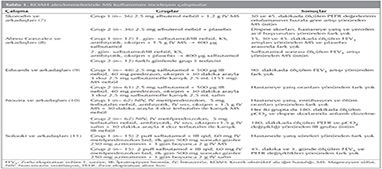 Magnezyum, kalsiyum aracılıklı bronş d?z kası kasılmasını, kolinerjik sinir u?larından asetilkolin ve mast h?crelerinden histamin salınımını engelleme gibi farklı mekanizmalarla bronkodilat?r etki g?sterebilen bir katyondur (3,4). Magnezyumun solunum kas fonksiyonları ?zerine faydalı etkileri olduğu da saptanmıştır (5). Bug?n i?in uluslararası klavuzlarda intraven?z (IV) yolla uygulanan magnezyum s?lfat (MS)'ın standart medikal tedaviye yanıt alınamayan ağır astım ataklarında ek tedavi y?ntemi olarak kullanılabileceği belirtilmektedir? (6). KOAH alevlenmelerinde kullanımıysa hen?z tavsiye edilmemektedir (1). KOAH alevlenmelerinde MS'nin etkinliğini inceleyen farklı metodolojilerin kullanıldığı az sayıda klinik ?alışmada ?elişkili sonu?lar elde edildiği g?r?lmektedir (Tablo 1).