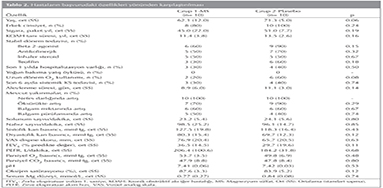 ?alışma s?resi boyunca polikliniğimize KOAH infektif alevlenme tanımına uyan toplam 74 hasta başvurdu. Hastaneye yatış ?l??tlerini karşılamayan (n= 22), başvuruda NIMV başlama gereksinimi g?steren (n= 19), akciğer grafisinde pn?monik infiltrasyon (n= 1) ve kitle (n= 1) g?r?nt?s? olan, klinik olarak pulmoner emboli kuşkusu taşıyan (n= 1), ağır kalp yetmezliği ile uyumlu ?yk? ve fizik muayene bulguları olan (n= 3), başvurudan ?nce sistemik kortikosteroid tedavisi başlanmış olan (n= 2), kooperasyon kurulamayan (n= 2), ?alışmaya katılmayı kabul etmeyen (n= 3) hastalar ?alışma dışında tutuldu. ?alışmaya dahil edilen yirmi hastanın 10 tanesi grup 1'e (standart medikal tedavi + neb?l MS), 10 tanesi ise grup 2'ye (standart medikal tedavi + plasebo) randomize edildi. Hastalar başvurudaki ?zellikleri y?n?nden karşılaştırıldığında iki grup arasında anlamlı farklılık saptanmadı (Tablo 2).