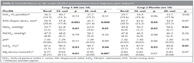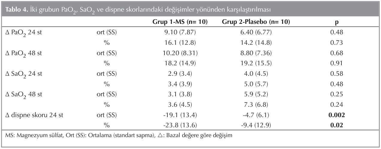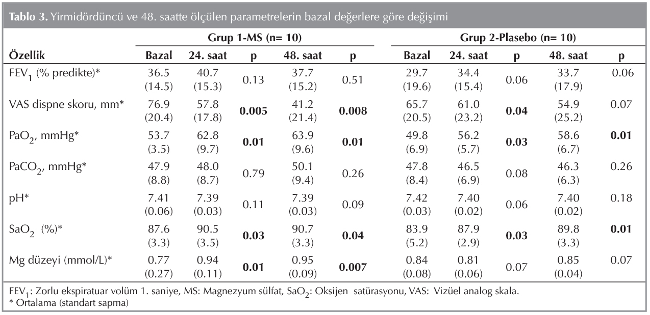 Her iki grupta da 24. ve 48. saatteki FEV1 değerlerinde bazal değerlere g?re anlamlı değişiklik saptanmadı. Her iki grupta da 24. saatteki dispne skorunda bazal değerlere kıyasla anlamlı farklılık tespit edilirken [24. saat ve bazal ortalama (SS) dispne skorları sırasıyla; MS grubu i?in 57.8 (17.8) ve 76.9 (20.4), p= 0.005, plasebo grubu i?in 61.0 (23.2) ve 65.7 (20.5), p= 0.04], 48. saatte sadece MS alan grubun dispne skorunda bazala g?re fark anlamlı bulundu [48. saat ve bazal ortalama (SS) dispne skorları sırasıyla; MS grubu i?in 41.2 (21.4) ve 76.9 (20.4), p= 0.008, plasebo grubu i?in 54.9 (25.2) ve 65.7 (20.5), p= 0.07]. Her iki grupta da 24. ve 48. saatte ?l??len PaO2 ve SaO2 d?zeylerinde bazala g?re anlamlı d?zelmeler saptandı. Yirmi d?rd?nc? ve 48. saatte ?l??len serum? Mg++ d?zeyleri plasebo grubunda bazala g?re anlamlı farklılık g?stermezken, MS grubunda anlamlı olarak y?kseldi (Tablo 3).