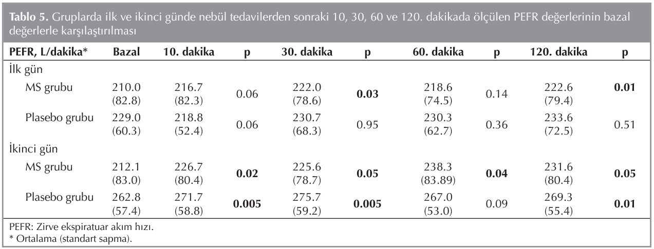 İlk g?nde her doz neb?l tedavi ?ncesinde yapılan bazal PEFR ?l??mlerinin ortalama (SS) değeri MS grubunda 210 (82.8) L/dakika, plasebo grubunda 229 (60.3) L/dakika olarak saptandı. MS grubunda neb?l tedaviler sonrasında 30. dakika [222 (78.6) L/dakika, p= 0.03] ve 120. dakika [222 (79.4) L/dakika, p= 0.01] PEFR değerlerinde bazal PEFR değerine g?re anlamlı artış saptanırken, plasebo alan grupta neb?l tedaviler sonrasındaki PEFR ?l??mleriyle bazal PEFR ?l??m? arasında anlamlı farklılık saptanmadı. İkinci g?ndeki ortalama (SS) bazal PEFR değerleri MS grubunda 212.1 (83.0) L/dakika, plasebo grubunda 262.8 (57.4) L/dakika idi. MS ve plasebo gruplarında sırasıyla neb?l tedaviler sonrasındaki 10. dakika [226.7 (80.4) L/dakika, p= 0.02 ve 271.7 (58.8) L/dakika, p= 0.005], 30. dakika [225.6 (78.7) L/dakika, p= 0.05 ve 275.7 (59.2) L/dakika, p= 0.005] ve 120. dakika [231.6 (80.4) L/dakika, p= 0.05 ve 269.3 (55.4) L/dakika, p= 0.01] PEFR ?l??mlerinde bazal değerlere kıyasla anlamlı artış saptandı (Tablo 5). MS alan grupta neb?l tedaviler sonrasında hastaların kan basıncı ve nabız değerleri anlamlı değişiklik g?stermedi.