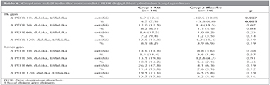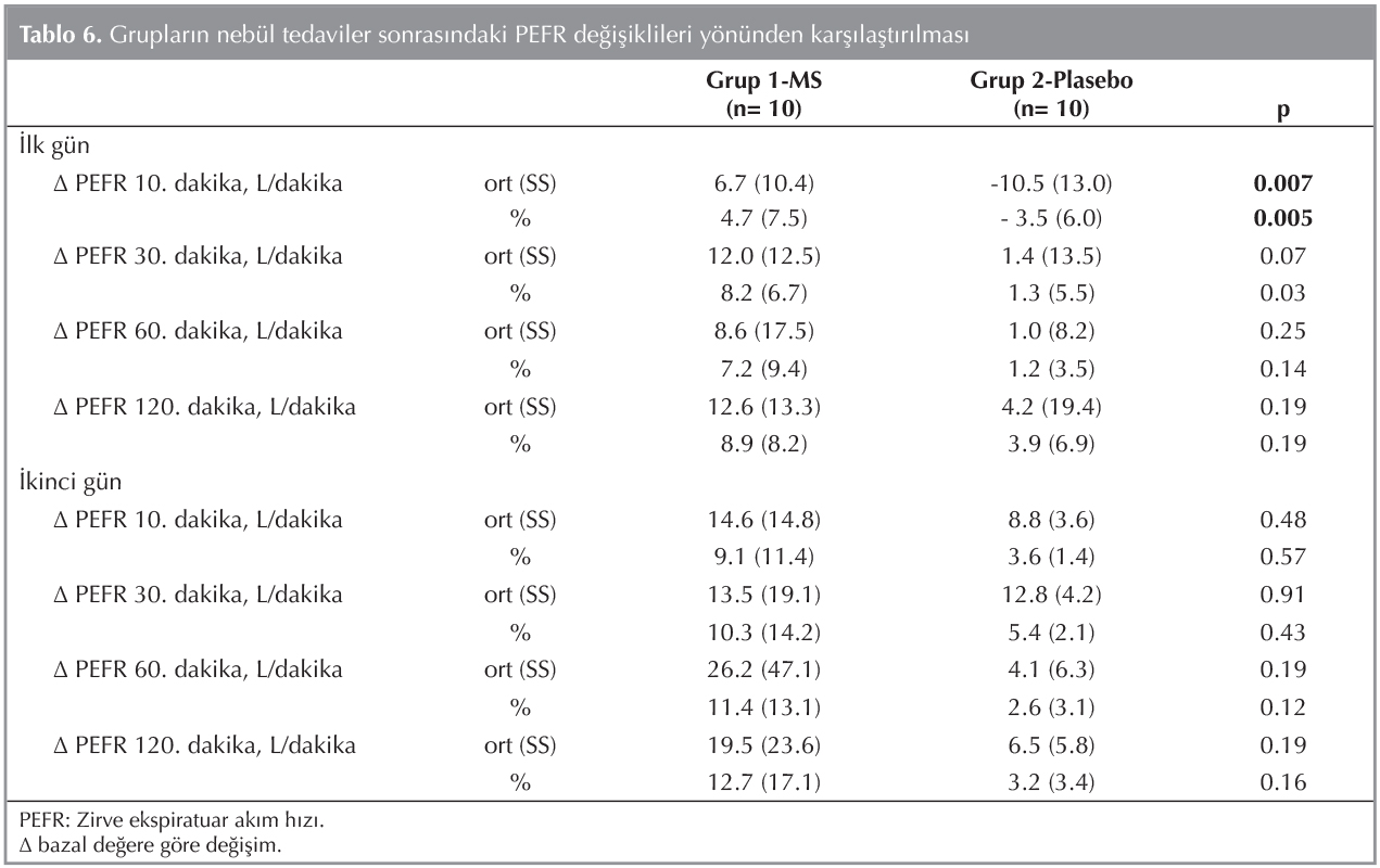 İki grup PEFR değerlerinde bazala g?re değişiklik y?n?nden karşılaştırıldığında ilk g?nde MS grubunda plasebo grubuna kıyasla 10. dakika ortalama (SS) PEFR değişikliği [6.7 (10.4) ve -10.5 (13.0), p= 0.007],? 10. dakika % PEFR değişikliği [4.7 (7.5) ve -3.5 (6.0), p= 0.005] ve 30. dakika % PEFR değişikliği [8.2 (6.7) ve? 1.3 (5.5), p= 0.03] y?n?nden anlamlı ?st?nl?k tespit edildi. İkinci g?nde ise PEFR değişiklikleri y?n?nden iki grup arasında anlamlı farklılık saptanmadı (Tablo 6).
