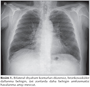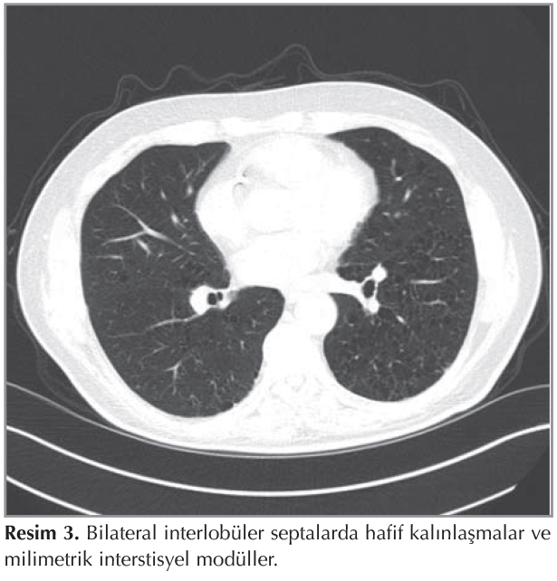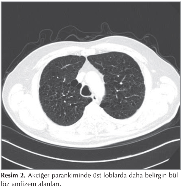 Olgumuz efor dispnesi nedeni ile polikliniğe başvuran altmış ?? yaşında erkekti. Fizik muayenesinde sağ ?st zonda nadir alanlar da ronk?sler duyuldu. ?zge?mişinde 40 paket/yıl sigara ?yk?s? mevcut olup 8 yıldır sigara kullanmıyordu. PA akciğer grafisinde diyafram konturları d?zensiz, amfizemat?z havalanma artışı ve bilateral pulmoner arterleri geniş izlendi (Resim 1). Solunum fonksiyon testinde FEV1: 3.28L (%120), FVC: 4.26 L (%123) ve FEV1/FVC: %77 idi. Karmonmonoksit dif?zyon testi %43 mmol/kPa/min idi. Ekokardiyografi incelmesinde ejeksiyon fraksiyonu %60 ve sistolik pulmoner arter basıncı (PAB) normaldi. Toraks BT'de akciğer parankiminde havalanma artışı ve ?st loblarda daha belirgin yaygın b?ll?z amfizem alanları ve her iki akciğerde interlobular septalarda hafif kalınlaşmalar ve milimetrik interstisyel nod?ller mevcuttu (Resim 2,3).