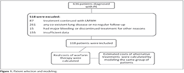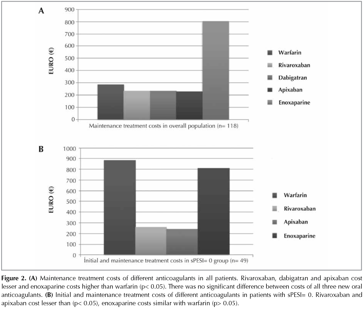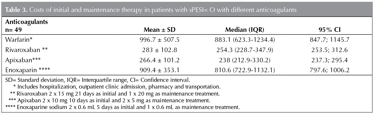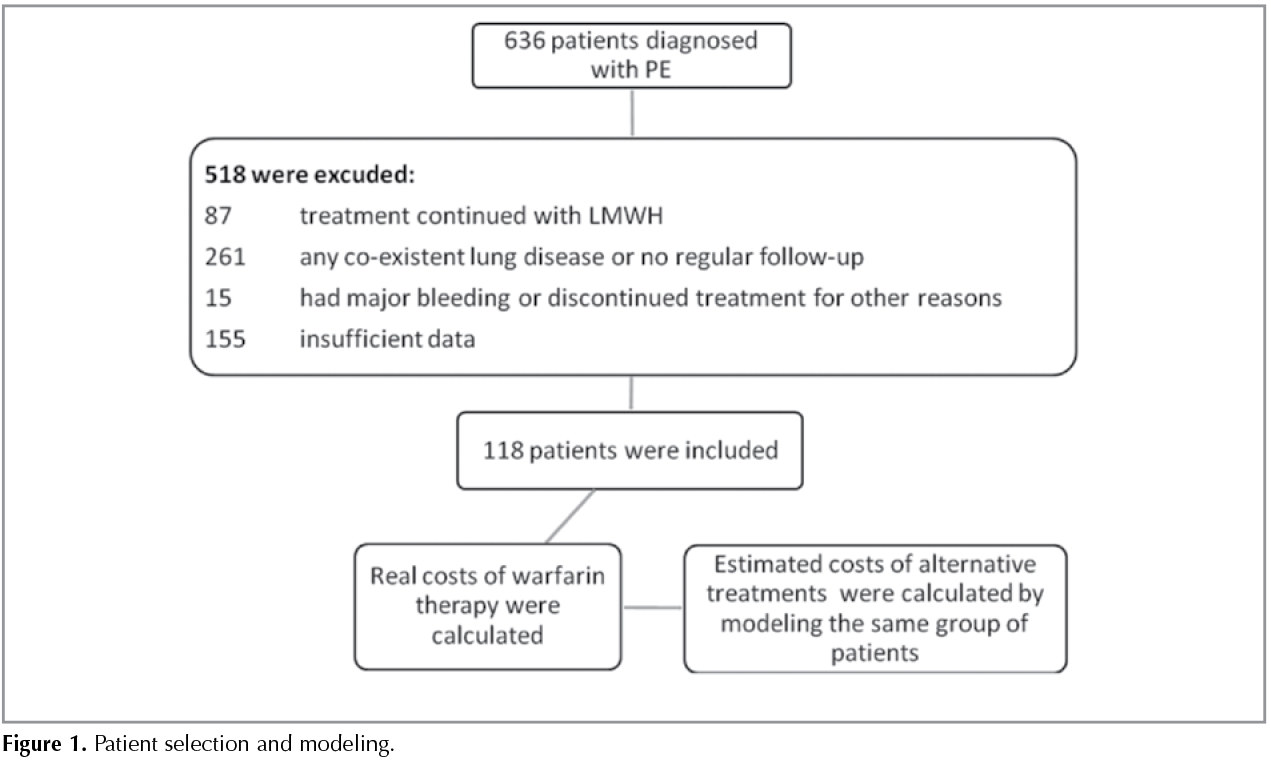Materials and Methods: Retrospective data of 118 patients with PE who were hospitalized and treated with warfarin for at least 3 months were evaluated. Direct medical and nonmedical costs were calculated. True costs with warfarin and modeled costs with rivaroxaban, dabigatran, apixaban and enoxaparine were calculated and compared for maintenance therapy. Estimated costs of initial and maintenance treatment with different anticoagulants were compared for the 49 patients with low complication risk.