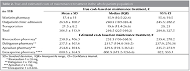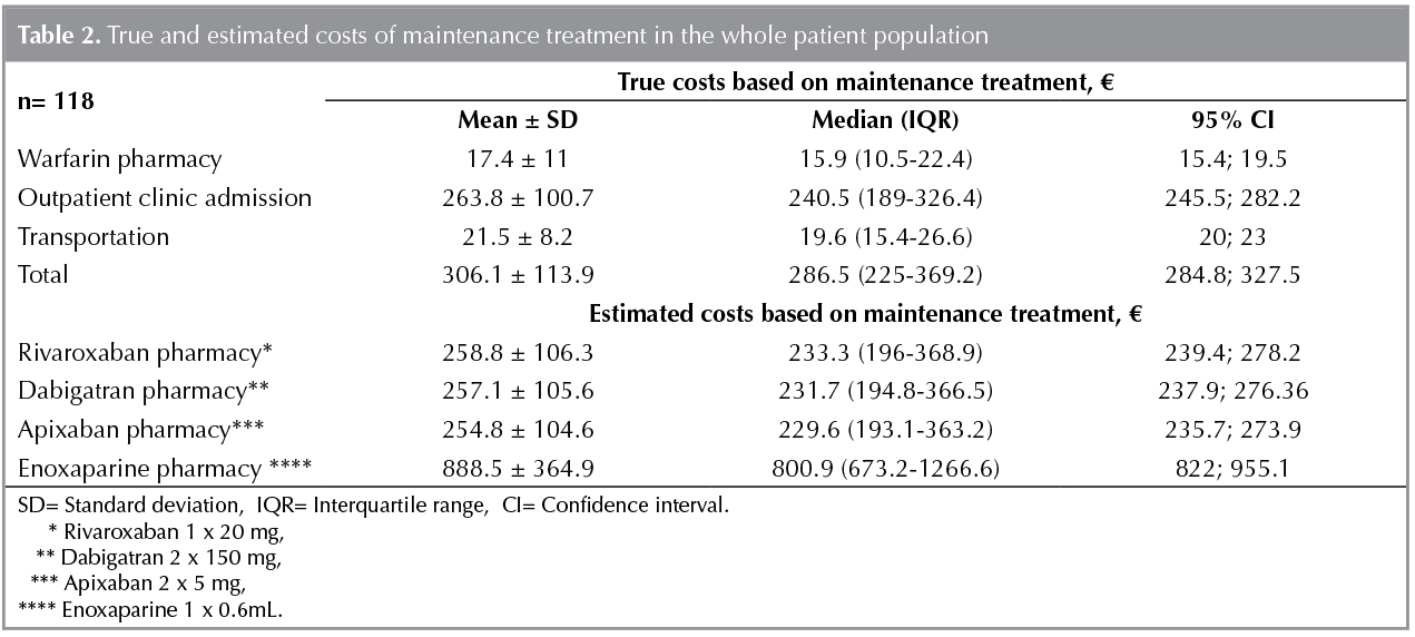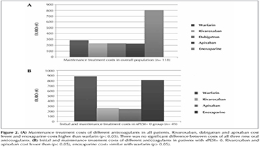 The estimated costs of maintenance treatment with rivaroxaban, dabigatran, apixaban or enoxaparine in a population with the same clinical features were calculated and compared by modeling the 118 patients under warfarin treatment. Since no complications occurred in selected patient group and no other hospitalization or routine controls were needed, only pharmacy costs were calculated for rivaroxaban, dabigatran, apixaban and enoxaparine.