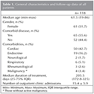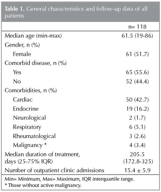 Demographic features (sex, age, marital status, and occupation), comorbidities, and follow-up data were recorded. For every patient, the number of admissions during their follow-up period was established. For those patients whose treatment was planned to be life long, data were recorded for a 1-year period. Clinically important minor bleedings were recorded.
