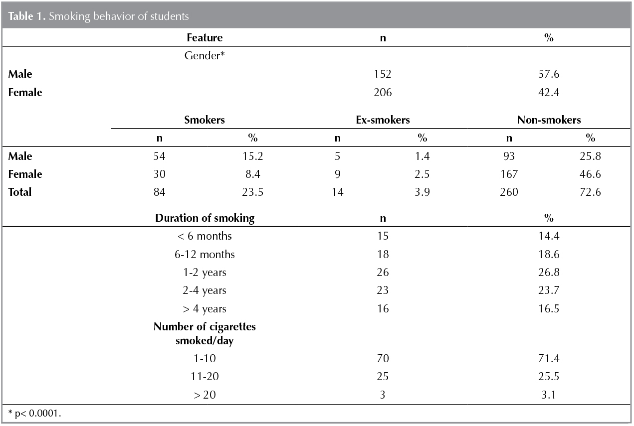 Out of 358 students who answered the survey completely, 152 students (42.4%) were male, 206 (57.6%) were female, 264 students (73.7%) were still at high school and 94 students (26.3 %) were high school graduates. Students were between the ages of 16-20 and the mean age was 18 ? 1.15. When asked about their smoking addiction, 54 (15.2%) of male students and 30 (8.4%) of female students, 84 (23.5%) of total actively continued to smoke. Smoking addiction does not show significant difference according to gender (p< 0.0001). Male students were smoking more than female students; this can be interpreted as a significant relationship between gender and smoking addiction. Higher smoking rate in male students than the one in female students showed correlation with the studies about this issue (11,12).