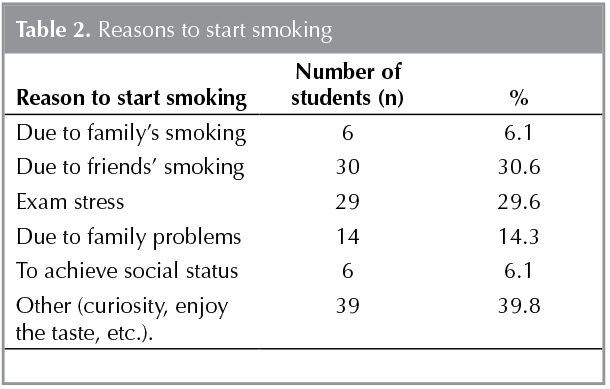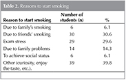 When queried the reasons to start smoking, Table 2 shows the reasons. Curiosity was the most commonly reported reason to start smoking (39%) and for the second row, they indicated to start smoking due to tobacco user friends (30.6%). There was no statistically significant relationship between students' smoking and smoking their families and friends.