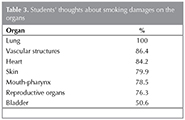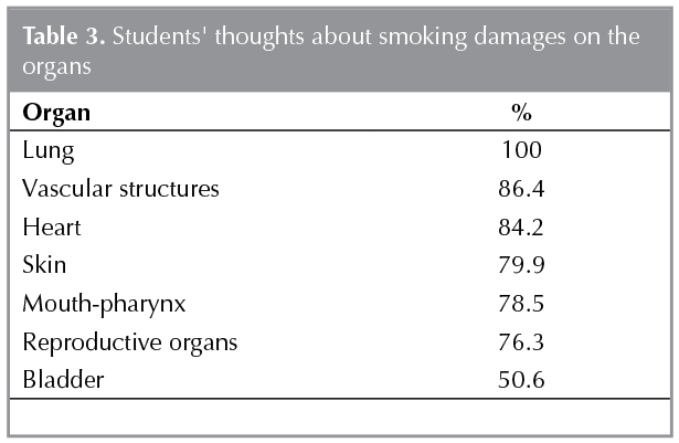 When students were asked about the health hazards of smoking and to which organs smoking damages the body, answers given by the students were indicated in Table 3.