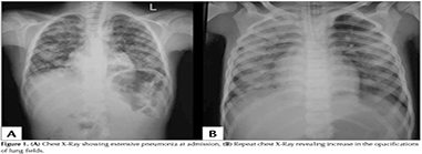 A 7-year-old previously healthy male presented with fever, cough without expectoration? since 7 days. He had recieved 2 days of co-amoxiclav tablets. There was no history of rash, sorethroat or ear discharge. On examination he was febrile (99.5?F), RR42/min, PR 96/minute and BP of 90/60 mm of Hg. Oxygen saturation at room air was 98%. There was no lymphadenopathy or conjunctival congestion. ENT examination was normal. Respiratory system examination revealed extensive crepitations all over the lung fields and bronchial breathing in the right interscapular area. Other systems examination was unremarkable. Investigations: -Hb 12.4 g/dL, TLC 7000/mm3, (Neutrophils 82%, Lymphocytes 16%), Platelet Count 2.81 lakhs/mm3 and ESR 35 mm. Chest X-Ray showed extensive pneumonia (Figure 1A]. His widal test, peripheral smear for malarial parasite, HIV serology and montoux test? were negative. He was started on Inj ceftriaxone and IV Linezolid. By 24 hours of admission child developed high degree fever (103?F) and severe respiratory distress (RR86/minute with chest retractions). Thinking of possibility of atypical pneumonia? started on azithromycin. Oxygen saturation was 90% at room air. Arterial blood gas analysis? showed a pH of 7.44, PCO2 of 30.4 mmHg, and PaO2 of 71 mmHg and HCO3 20. He was put on ventilator and after 2 hours he developed blood stained secretions from endotracheal tube. His TLC increased to 16940/mm3, neutrophils 90% and platelets 4.06 lakhs/mm3. His PT, aPTT and KFT were normal. His repeat chest X-Ray revealed increase in the opacifications of lung fields (Figure 1B). A nasopharyngeal swab for H1N1 viral testing and sputum for AFB, bacterial Gram stain and culture were obtained and started on oseltamivir along with IV meropenam. Pneumoslide-M test (Indirect immunofluorescence technique for IgM detection) which detects M. pneumoniae, L. pneumophila, Chlamidya pneumonia, Coxiella burnetii, Adenovirus, Respiratory Syncytial Virus, Influenza A,B, Parainfluenza (serotypes 1,2,3) done and was positive for M. pneumoniae. His urinary antigen detection for L. pneumophila was negative. Sputum gram stain showed gram-positive cocci in pairs and few gram negative bacilli and AFB stain was negative. Repeat arteial blood gases showed metabolic acidosis and PaO2 was decreasing. Gradually he developed septic shock features and started on inotropes. ECHO showed ejection fraction of 35%. Child was not maintaining oxygen saturation even with maximum ventilator support and repeat chest X-Ray showed deterioration of lung fields. Inspite of our efforts child could not be revived and declared dead within 48 hours of admission. His blood culture was sterile. TaqMan real time Polymerase chain reaction testing of nasopharyngeal swab specimen was positive for Swine influenza A H1N1 and negative for influenza B.