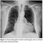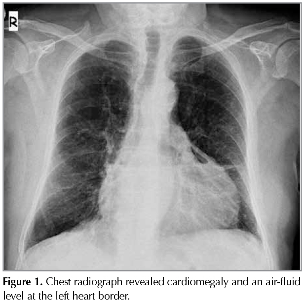 A 69-year-old man was admitted for fever and dyspnea associated with productive cough, sputum. He had COPD for five years and was using inhaled bronchodilators. He had a history of 45 pack-year smoking. Also he had hypothyroidism, he was using levothyroxine but he had for gotten to take the drug for two weeks. On admission, his temperature was 38.3?C, with a respiratory rate of 28 breaths perminute, a pulse of 100 beats perminute, and a blood pressure of 110/70 mmHg. Breathing sounds were decreased bilaterally. The complete blood cell count on admission revealed a white blood cell count of 18.770/mm3 (neutrophils, 85.7%; lymphocytes, 9.5%; monocytes, 4.6%; eosinophils, 0.1%; basophils, 0.1%), hemoglobin level of 12.0 g/dL, platelet count of 195.000/mm3, and T3: 0.42 ng/mL, T4: 3.06 ng/mL, TSH: 20.43 IU/mL. C-reactive protein and procalcitonin was markedly elevated to 292 mg/L and 0.9 ng/mL respectively. His anteroposterior chest radiograph revealed cardiomegaly and we observed an air-fluid level at the left heart border (Figure 1). Computed tomography (CT) showed? 2 cm pericardial effusion and air in the pericardial space (Figure 2). There was no evidence of pneumomediastinum. Echocardiogram showed a mild pericardial effusion with no echocardiographic evidence of cardiac tamponade. The patient was man aged conservatively with antibiotics, bronchodilators and he was started on levothyroxine treatment and, subsequently, clinical symptoms, pericardial effusion and air in the pericardial spacere solved with the treatment.