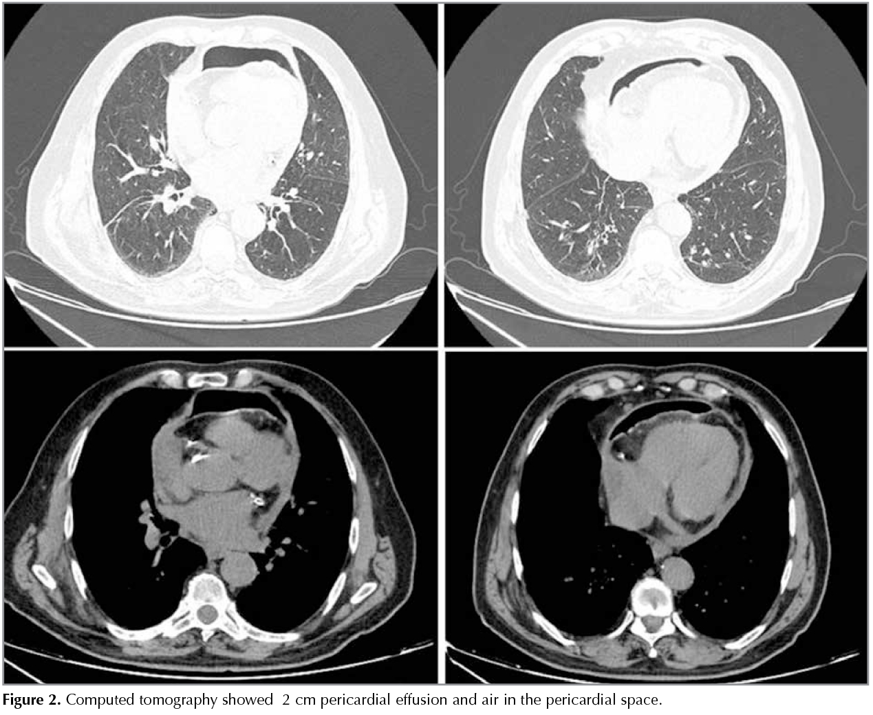 Pneumopericardium can be diagnosed by conventional chest radiography, CT, or echocardiography (8). We noticed an air-fluid level on chest graph of our patient and after that confirmed by CT.