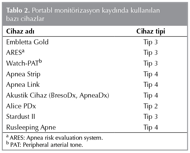 Amerikan Uyku Tıbbı Akademisi "American Academy of Sleep Medicine (AASM)" tarafından, uyku kaydı yapılmasına olanak sağlayan d?rt tip cihaz tanımlanmıştır (3).