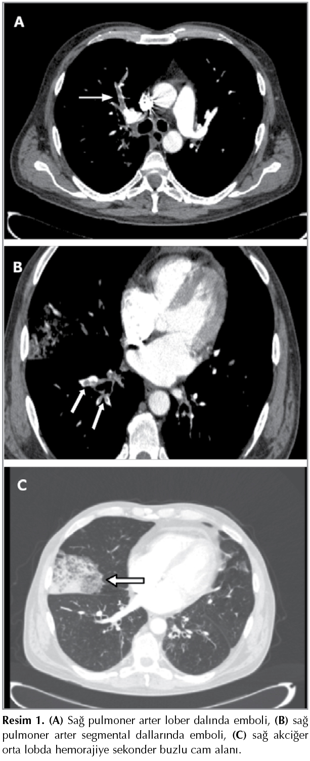 Elli yaşındaki erkek hasta 4 ay ?nce tanı aldığı ?lseratif kolitin atak tedavisi i?in gastroenteroloji servisinde yatarak metilprednizolon ve azatioprin tedavisi almakta idi. Hastanın ?zge?mişinde 30 paket/yıl sigara i?me ?yk?s? vardı. Yatışının 22. g?n?nde hastada sağ yan ağrısı ve taşikardi gelişti. Kan basıncı 100/60 mmHg, O2 sat?rasyonu %96 (O2 desteği ile), nabız: 155/dakika, solunum sayısı: 26/dakika idi. Kan tetkiklerinde; hemoglobin: 10.6 g/dL, beyaz k?re: 15.500 K/uL, platelet: 199.000 K/uL, troponin-I: 18 ng/mL (normal < 14 ng/mL) idi. PE ?n tanısıyla ?ekilen Toraks bilgisayarlı tomografi (BT)'sinde "sağ pulmoner arterin lober ve segmental dallarında, sol pulmoner arterin ?st lob segmental dallarında emboli ile uyumlu dolum defekti" ve "sağ akciğer orta lob lateralde, etrafında buzlu cam dansitesinin eşlik ettiği geniş boyutta hemorajiye sekonder konsolidasyon alanı" saptandı (Resim 1A,B,C). Hastaya heparin inf?zyon tedavisi başlandı. Takipte saatler i?inde hastanın tansiyonu 80/50 mmHg olması ?zerine hasta yoğun bakıma alındı ve 100 mg/2 saat alteplaz tedavisi verildi. Trombolitik tedaviye yanıt vermeyen hasta yoğun bakıma yatışının 16. saatinde eks oldu.