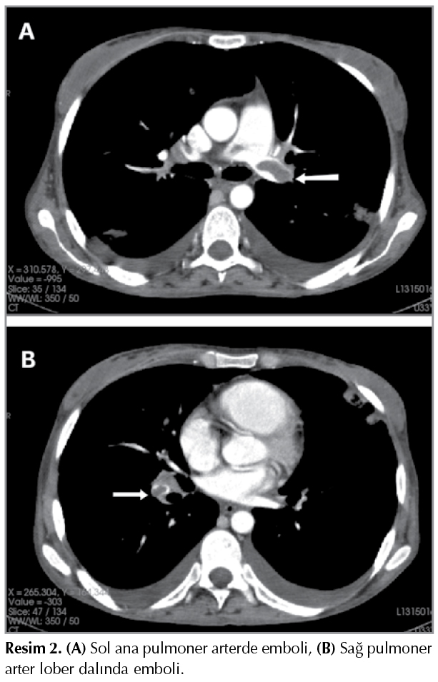 Otuz ?? yaşındaki kadın hasta 8 ay ?nce Crohn hastalığı tanısı almıştı, t?m?r nekroz fakt?r?-alfa (TNF-) inhibit?r? ve steroid tedavisi başlanmıştı. Hasta halsizlik, ateş, iştahsızlık ve anemi nedeniyle gastroenteroloji servisine yatırıldı. Oral alamayan hastaya periferik damar yolu a?ılamadığından santral kateter takıldı. Yatışının 2. g?n?nde hastanın g?ğ?s ağrısı, nefes darlığı ve senkop gelişmesi ?zerine hastaya toraks BT ?ekildi. Toraks BT'sinde "her iki akciğer ana pulmoner arterde, sağ akciğer ?st ve alt lob, sol akciğer ?st ve alt lob lober, segmental ve subsegmental pulmoner arter dallarında emboli ile uyumlu dolum defekti" saptandı (Resim 2A,B). Bu d?nemde yapılan kan tetkiklerinde hemoglobin: 9.4 g/dL, beyaz k?re: 2800 K/uL, platelet: 120.000 K/uL, D-Dimer: 1.68 ng/mL (normal < 0.5) idi. ?ncesinde tromboz profilaksisi almayan hastaya standart heparin tedavisi başlandı. İki g?n sonra ?ekilen ekokardiyografide; sistolik pulmoner arter basıncı: 40 mmHg ve sağ boşluklarda dilatasyon saptandı. Heparin tedavisi altında yatışının 7. g?n?nde hastada nefes darlığında artış, taşikardi ve O2 sat?rasyonunda d?şme saptandı. Hastanın tansiyonu 80/50 mmHg olması olması ?zerine hastada reemboli d?ş?n?ld?. Bu d?nemde ise D-Dimer seviyesi 9.68 ng/mL'e y?kseldi, troponin-I: 0.299 ng/mL (normal < 0.04)'du. Arterial kan gazında pH 7.47; PCO2: 25 mmHg; PO2: 27 mmHg; O2 sat?rasyonu %50 idi. Hasta yoğun bakıma alınarak 100 mg alteplaz verildi. Hasta arrest olunca 2. kez trombolitik tedavi verildi. Hasta yoğun bakıma yatışının 2. g?n?nde (hastaneye yatışın 9. g?n?) eks oldu.