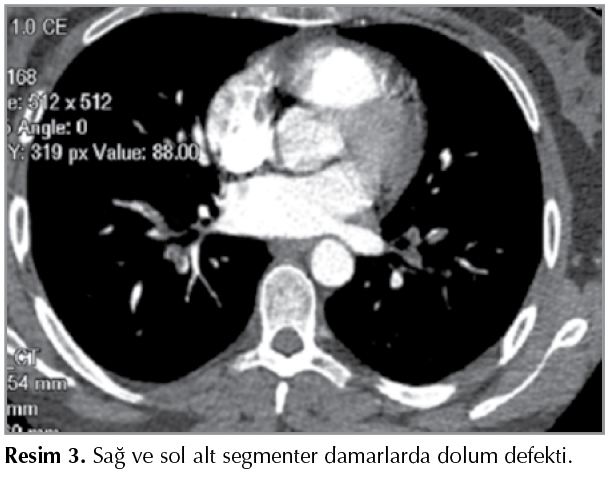 Otuz beş yaşındaki kadın hasta 1.5 ay ?nce ?K tanısı almıştı, 2 hafta hastanede yatırılarak tedavi aldıktan sonra oral azatioprin ve steroid tedavisi başlanarak taburcu edilmişti. Taburcu edildikten 2 hafta sonra hastada nefes darlığı, sırt ağrısı ve hemoptizi şikayeti başlamıştı. Fizik muayenesinde; kan basıncı 90/60 mmHg, nabız: 78 atım/dakika, oksijen sat?rasyonu %97 ve solunum sayısı 28 /dakika idi. Kan tetkiklerinde; hemoglobin 10.1 g/dL, beyaz k?re 10.800 K/uL, platelet 397.000 K/uL idi. D-dimer seviyesi 0.88 mg/L (normal < 0.5) idi. Bunun ?zerine ?ekilen toraks BT'sinde sağ ve sol alt segmenter damarlarda dolum defekti saptandı (Resim 3). Hastaya d?ş?k molek?l ağırlıklı heparin (DMAH) başlandı ve daha sonra warfarin tedavisi eklenen hasta yatışının 7. g?n?nde taburcu edildi.