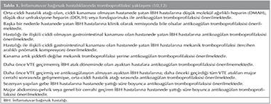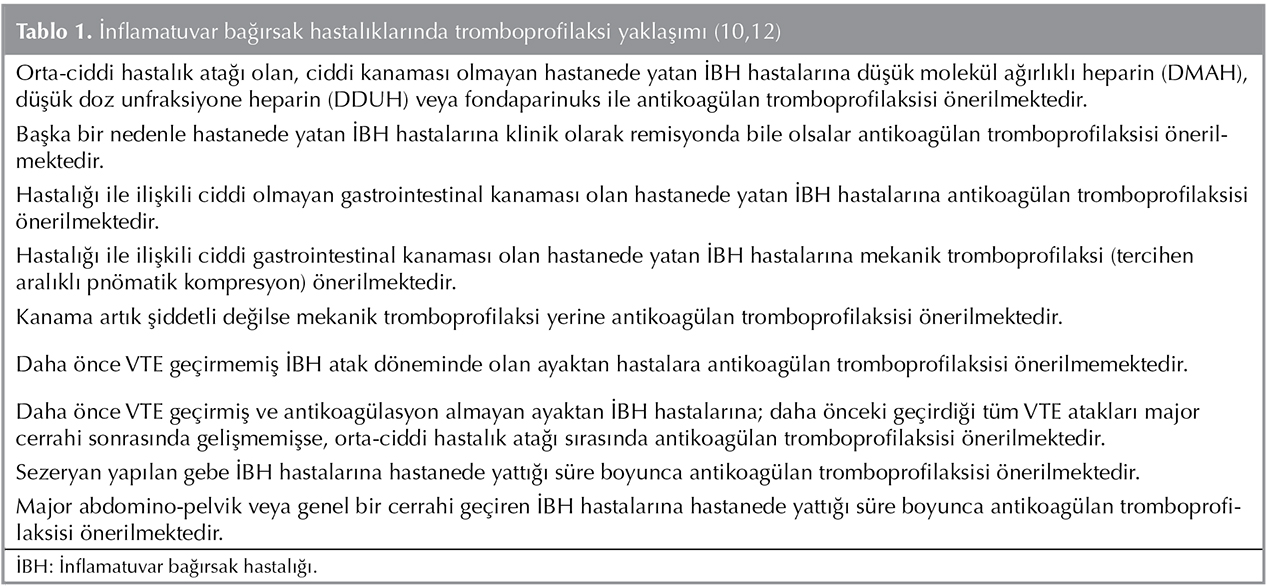 Hekimlerin bu artmış VTE riskinin farkında olmalarına rağmen, İBH hastalarında VTE y?netimine ilişkin klinik pratikte sorun yaşanabilir. ?rneğin bu hastalarda kanlı ishal varlığı antikoag?lan kullanımı i?in yanlış bir şekilde kontrendikasyon olarak değerlendirilmektedir. İlaveten İBH dışı bir durum nedeniyle hastaneye yattıklarında profilaksi ve VTE geliştiğinde antikoag?lasyonun s?resi gibi konularda belirsizlik vardır (10). Bu hastalar diğer hastalar gibi akut PE tanısı aldıklarında tedavi edilmelidirler ve hastaneye yattıklarında da ciddi kanama gibi kontrendikasyona yol a?acak durum yoksa tromboprofilaksi yapılması gerekmektedir. Hastanede yatmakta olan İBH'li hastalara; tromboprofilaksi amacıyla standart heparin (g?nde 2 x 5000 U veya y?ksek riskli hastalarda 3 x 5000 U, cilt altı), d?ş?k molek?l ağırlıklı heparin (enoksoparin g?nde 1 x 40 mg, cilt altı veya dalteparin g?nde 1 x 5000 U, cilt altı) ya da fondaparinuks (g?nde 1 x 2.5 mg, cilt altı) ?nerilmektedir. Kanama riski y?ksek olan hastalarda mekanik tromboprofilaksi yapılması gerekir. Bu ama?la basın?lı elastik ?oraplar (diz ve uyluk boyu) ve aralıklı pn?matik kompresyon cihazları kullanılır (11). İBH'de tromboprofilaksi yaklaşımı Tablo 1'de ?zetlenmiştir (10,12).