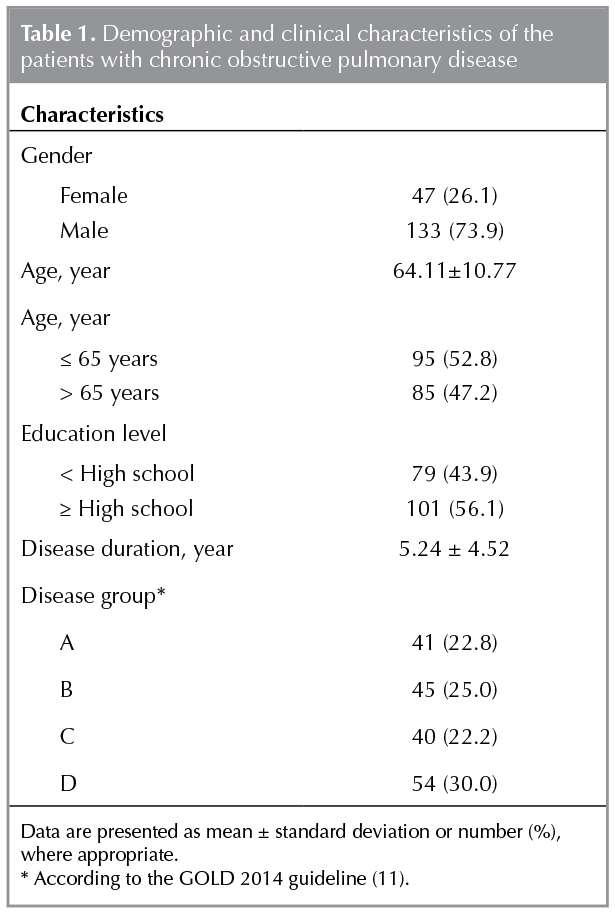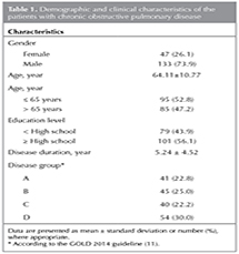 The mean age of 180 patients with COPD was 64.11 ? 10.77 years and 133 of them were male. Demographic and clinical characteristics of the patients are presented in Table 1.