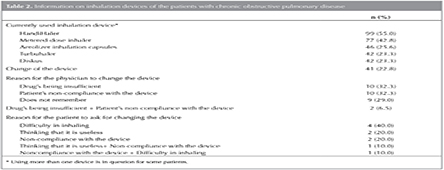 Mistakes in using inhalation devices are important handicaps for the patients to benefit from their treatment. In the present study, it was determined that 9.5% of the patients discontinued their treatment in a period over the course of their diseases and among these patients, the rate of those thinking that drugs are not beneficial for them was found to be 57.9%. In the study conducted by VanderSchaafet al. patients reported the reason for not using the inhalation device to be the feeling that inhalers did not help breathing (20%) (14). Such substantial loss of compliance with and involvement in treatment cause considerable problems in terms of long-tern complications and disease management.