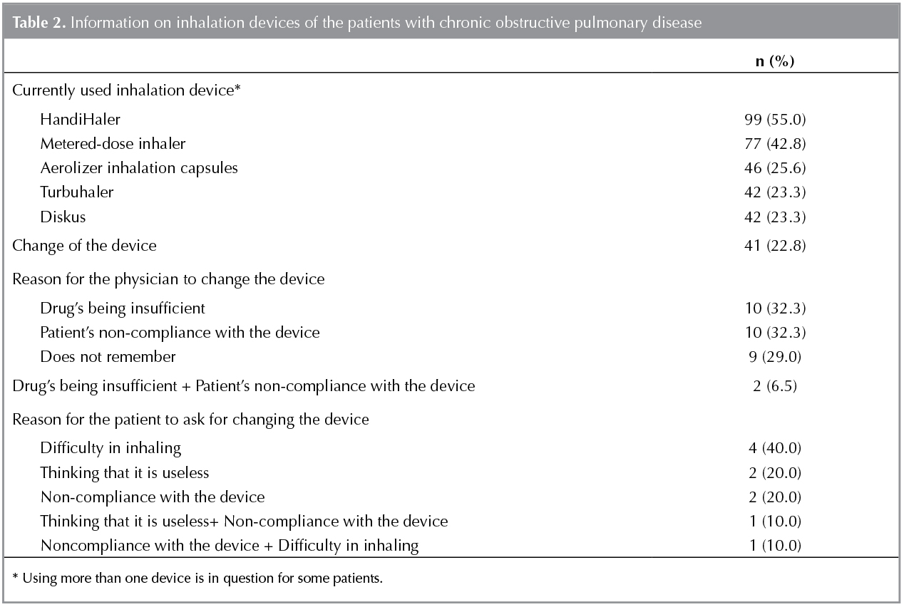 Three-hundred and six questionnaire forms were completed for 5 devices used by the patients. Inhalation devices used by the patients are presented in Table 2. Some patients used more than one device. It was determined that inhalation device was changed in 41 (22.9%) patients, of whom 31 were changed by the physician and 10 were changed on the patient's demand over the course of treatment period (Table 2).