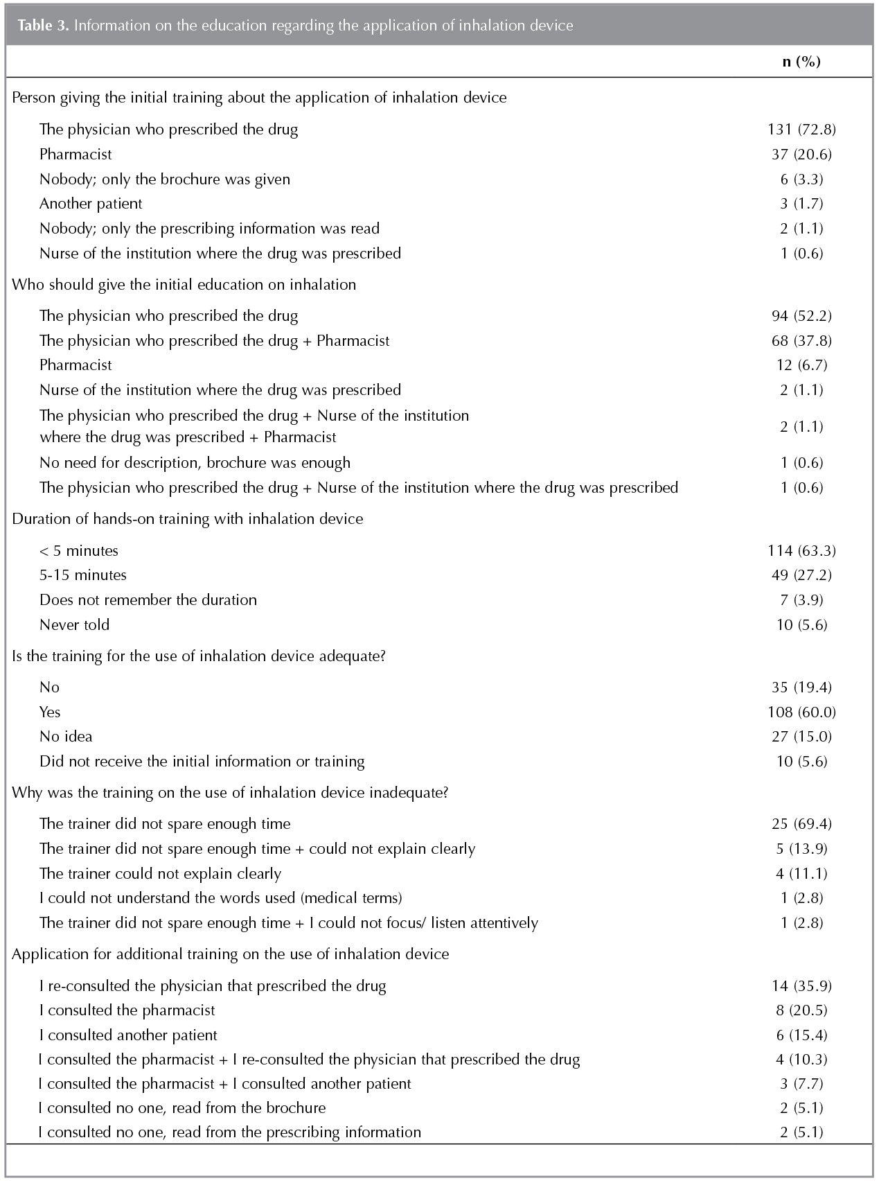 One hundred and thirty-one (72.8%) patients stated that they received the initial education about the application of inhalation device from the physician who prescribed the drug, whereas 37 (20.6%) patients stated that they received the initial education from the pharmacist. Of these patients, 60% were in the opinion that the education was adequate (Table 3).