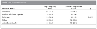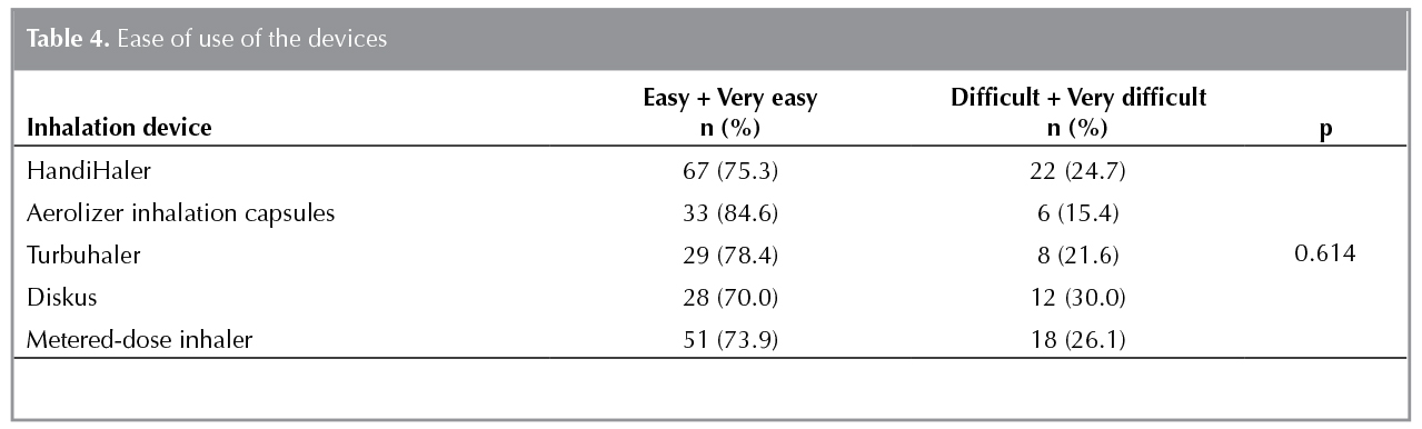 Of the patients, 155 (86.1%) reported that the physician did not ask them to test different inhalation devices before prescribing the inhaler. The patients rated the ease of using the devices as very easy, easy, difficult, very difficult, or no idea. After excluding those stated as no idea from the analyses, those stated as easy + very easy were compared with those stated as difficult + very difficult. No difference was found between the devices in terms of ease of use (Table 4).