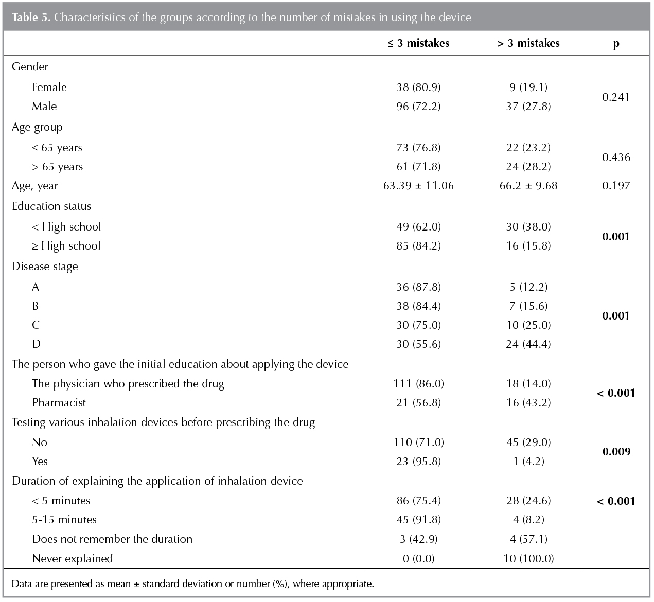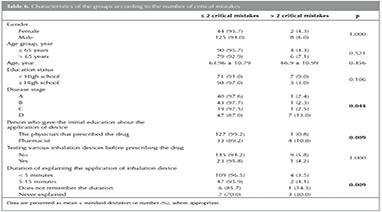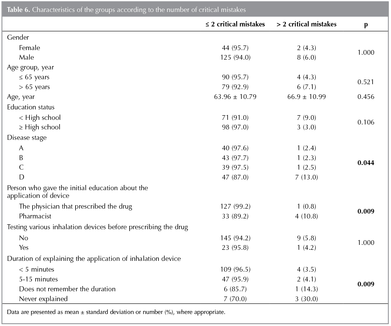 When the patients having ≤ 2 and > 2 critical mistakeswere compared, no difference was found in terms of gender, age, and education status. Disease stage, trainer for the usage of device, and duration of training were found to be associated with the number of critical mistakes. No difference was determined between the critical mistake groups in terms of testing various inhalation devices before prescription (Table 6).