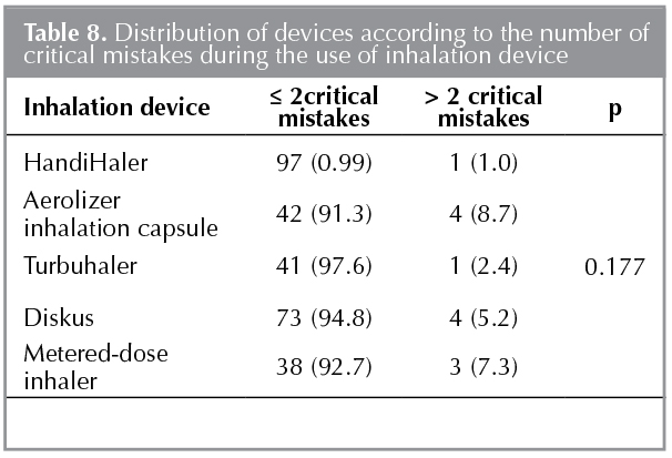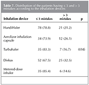 Distribution of the patients having ≤ 3 and > 3 mistakes according to the inhalation devices is presented in Table 7. The rate of making > 3 mistakes was not different between the types of devices.