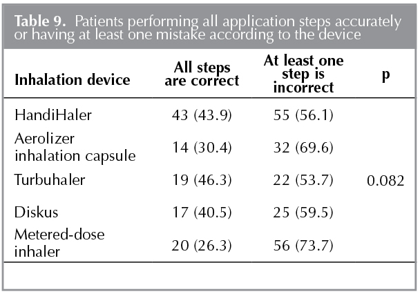 The rate of performing all application steps accurately while applying inhalation devices is presented in Table 9. The rate of performing all application steps accurately was not different between the types of devices.
