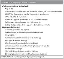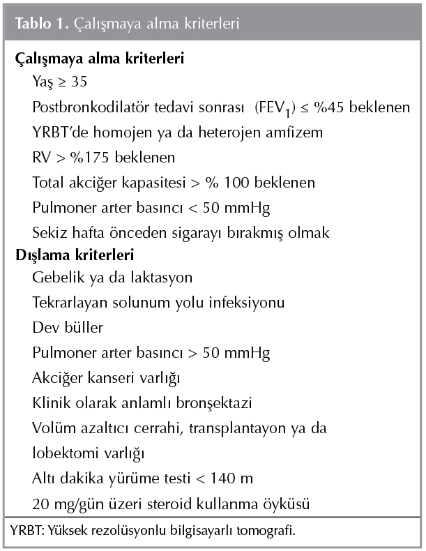 ?alışma Ağustos 2014-Ağustos 2015 arasında YRBT'de heterojen ya da homojen amfizemi olan GOLD sınıflamasında tanımlanmış grup 3 ve 4 kronik obstr?ktif akciğer hastalığı (KOAH) hastalarında prospektif olarak yapıldı. Etik kurul onayı alındı ve "National Emphysema Treatment Trial (NETT)" ?alışmasında belirtilen hasta alma ve dışlama kriterlerine uygun hasta se?ildi (6) (Tablo 1).