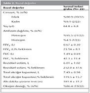 Bulgular: 54-77 yaş arası (64.8 ? 6.8), 20 (%90.9)'si erkek , 2 (%9.1)'si kadın? olmak ?zere toplam 22 hasta hacim azaltıcı sarmal tedavisi ile tedavi edildi. FEV1 değerleri beklenenin 23.54 ? 8.1 olarak belirlendi. Bir hasta unilateral 21 hasta bilateral tedavi edildi. Her bir akciğere 10 adet (9-16) coil, 27.14 dakika (12-50) s?rede yerleştirildi. YRBT'sinde amfizem hasar skorlamasının y?ksek olduğu loblarda perf?zyonunda azaldığı g?r?ld?.? İşlem ?ncesi ve sonrası ?l??mler arasında; FEV1, RV ve TAK y?n?nden istatistiksel olarak anlamlı fark olduğu bulundu (p< 0.05). Altı dakika y?r?me testinde 45.4 ? 23.9 m (p= 0.000) istatistiksel olarak anlamlı fark saptandı. İşlem ?ncesi perf?zyon oranlarında tedavi sonrası anlamlı değişiklik olmadığı belirlendi.??