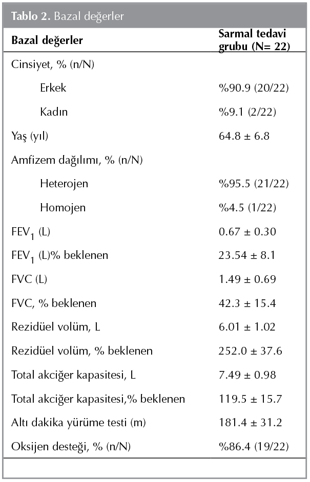 Ağustos 2014-Ağustos 2015 tarihleri arası 22 hasta tedavi edildi. Hastaların demografik ve bazal değerleri Tablo 2'de g?sterildi. Bir hasta unilateral, 21 hasta bilateral tedavi edildi. Unilateral işlem yapılan hastanın sol akciğerde dev b?l olması nedeniyle sadece sağ ?st lob tedavisi yapıldı. Hastaların her bir lobuna ortalama 10 adet (range 9-16) sarmal yerleştirildi. İşlem s?resi ortalama 27.14 dakika (range 12-50 dakika) olarak belirlendi. Toplam t?m hastalarda 240 sarmal kullanıldı. İşlem sırasında ya da sonrasında pn?motoraks g?r?lmedi. %22.7 oranında min?r hemoraji gelişti.