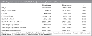 Bu ?alışmadaki en ?nemli ve anlamlı sonu? hastaların FEV1,RV ve TAK y?n?nden istatistiksel olarak anlamlı d?zelmeler olması yanısıra altı dakika y?r?me testinde de belirgin d?zelme olmasıdır.