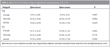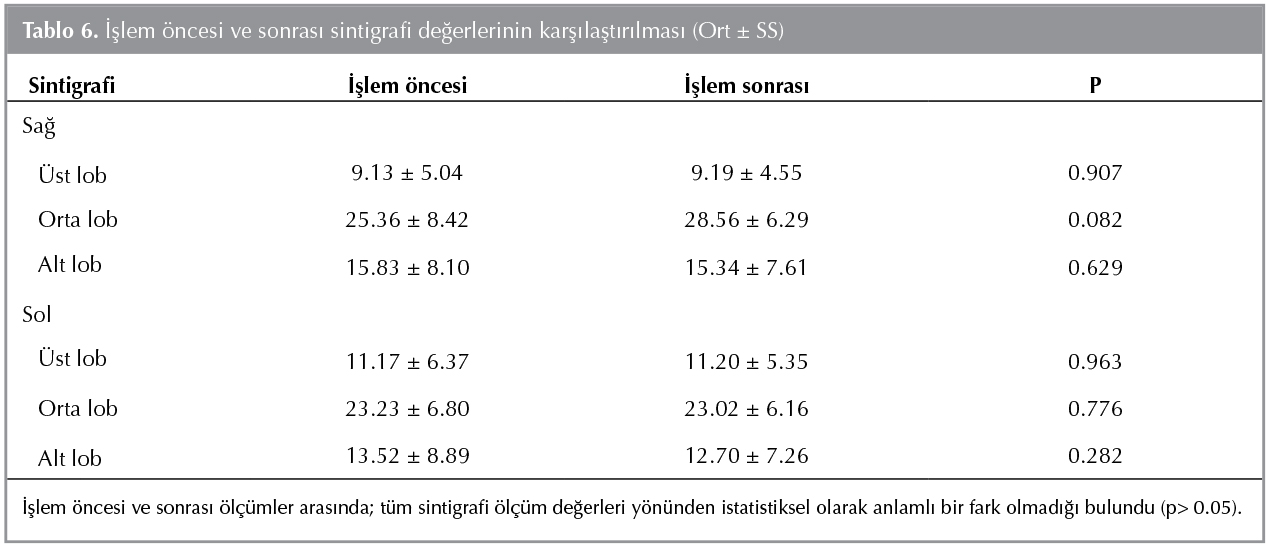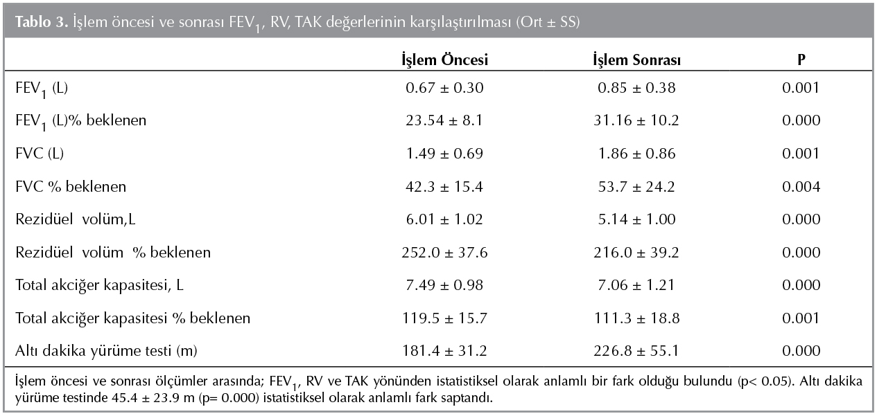 İşlem ?ncesi ve sonrası ?l??mler arasında; FEV1, RV ve TAK y?n?nden istatistiksel olarak anlamlı bir fark olduğu bulundu (p< 0.05). Altı dakika y?r?me testinde 45.4 ? 23.9 m (p= 0.000) istatistiksel olarak anlamlı fark saptandı (Tablo 3). Olguların YRBT'sinde dansitometrik olarak hesaplanan amfizem skorları sağ ?st lob i?in skor 2 (5-10 mm b?l) %40.9, skor 3 (bleb ya da 10-20 mm b?l) %31.8, skor 4 %22.8 (panlobuler amfizem ya da 20-50 mm b?l),? sol ?st lob i?in skor 2 (5-10 mm b?l) %45.5, skor 3 (bleb ya da 10-20 mm b?l) %27.2, skor 4 %18.2 (panlobuler amfizem ya da 20-50 mm b?l) olarak hesaplandı (Tablo 4). Kantitatif perf?zyon sintigrafilerinde sağ ?st lob perf?zyonu ortalama %9.1, sol ?st lob perf?zyonu ortalama %11.7 olarak hesaplandı. Amfizem skorunun y?ksek ve perf?zyonun d?ş?k olduğu lobları tedavi alanı olarak belirledik. Bu perf?zyon oranları YRBT'deki amfizem skorları ile karşılaştırıldı (Tablo 5). BT'de amfizem skoru y?ksek olan alanlarda perf?zyonun da azaldığı g?r?ld?. Ancak istatistiksel olarak anlamlı bulunmadı. Tedavi ?ncesi ve sonrası perf?zyon değerleri karşılaştırıldığında işlem ?ncesi ve sonrası perf?zyon oranlarında istatistiksel olarak anlamlı bir değişiklik olmadığı g?r?ld? (p> 0.05) (Tablo 6).