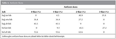 YRBT tetkikleri sensation 64 kesit (Somatom, Siemens, Germany) bilgisayarlı tomografi (BT) cihazı ile Lung Care Software programı (Pulmo Ct, Leonardo Siemens) kullanılarak yapıldı. Bu y?ntemle tedavi planı i?in heterojenite ve amfizem hasar skoru belirlendi. Her lob i?in amfizem skoru i?in 0-5 puan arasında hasar belirlendi; 0-skor: parankimde hasar yok, 1-skor: orta sentrilobular hasar ile 1-3 mm b?l, 2-skor: sentrilobular hasar ile maksimum 5-10 mm b?l, 3-skor: bleb ya/ya da k???k b?l maksimum 10-20 mm, 4-skor: panlobuler hasar ile b?l 20-50 mm, 5-skor: ciddi b?ll?z hastalık (1,7).