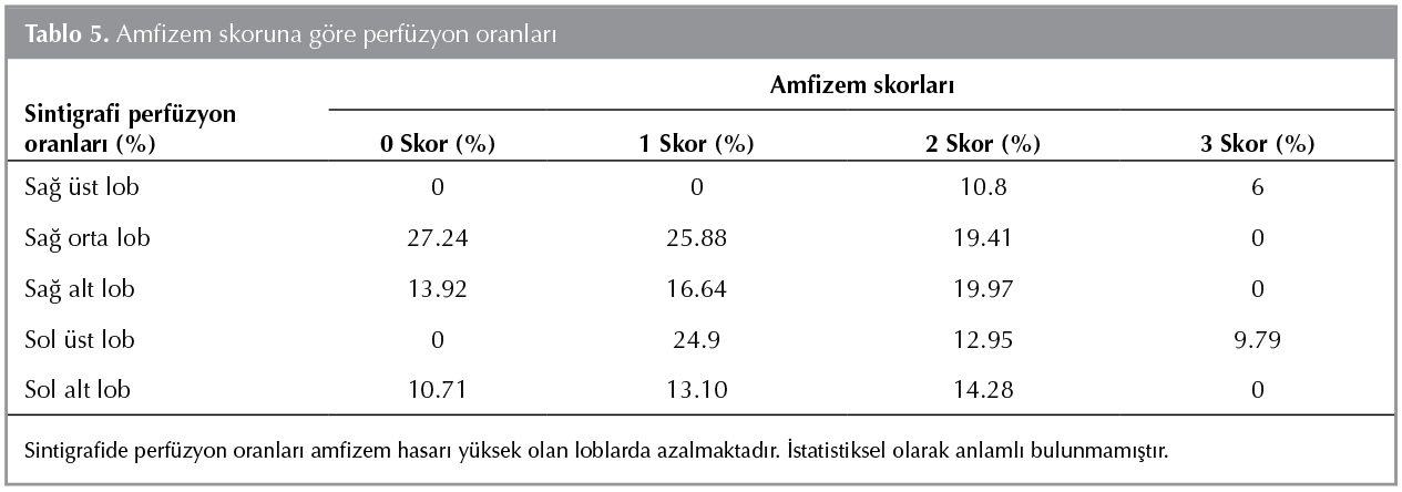 Amfizem varlığında hastalığın yaygınlığının ve dağılımının saptanması kesitsel g?r?nt?leme ve n?kleer tıp alanındaki gelişmelere paralel olarak son yıllarda tedavi planlamasında ?nemli olması nedeniyle daha da ?nem kazanmıştır. Cerrahi olarak hacim azaltma tedavisinde olduğu gibi bronkoskopik hacim azaltıcı sarmal tedavi y?nteminde de YRBT'ye ek olarak amfizemin neden olduğu fonksiyonel hasarın heterojenitesi ve dağılımı konusunda ilave bilgi elde etmek amacıyla kantitatif perf?zyon sintigrafi yapılması faydalı olabilir. Bronkoskopik hacim azaltıcı sarmal tedavi ?ncesi YRBT'ye ek olarak kantitatif perf?zyon sintigrafisinin yapılmasının sağladığı katkıyı g?steren literat?rde yayımlanmış ?alışma yoktur. Bu nedenle bronkoskopik hacim azaltıcı sarmal tedavi planladığımız hastaların hedef lobunu belirlerken kantitatif perf?zyon sintigrafisinin ?nemini belirlemek ama?lı yaptığımız ?alışmamızda amfizem skorunun artmasıyla beraber perf?zyonun da azaldığını ancak istatistiksel olarak anlamlı olmadığını g?rd?k. Cerrahi olarak hacim azaltma ile ilgili bu konuda yapılmış ?alışmalar bulunmaktadır. Cleverley ve arkadaşları? YRBT ile değerlendirilen amfizem dağılımı ve sintigrafi ile değerlendirilen perf?zyon dağılımı arasında iyi korelasyon olduğunu g?stermişlerdir (11). Ancak operasyon sonrası fonksiyonel iyileşme,? YRBT'de saptanan heterojenite ile sintigrafide saptanan heterojeniteye kıyasla daha fazla korelasyon g?stermektedir (12,13). Bronkoskopik hacim azaltıcı sarmal tedavi de amfizem heterojenitesinin değerlendirmesinde sadece? YRBT ya da? YRBT ve sintigrafinin birlikte kullanılması ile ilgili yapılmış ?alışma yoktur. İki tetkikin bir arada kullanılması ile ilgili ?alışmalar cerrahi olarak hacim azaltma tedavisi konusunda yapılmıştır. Yine bu konuda Cederlund ve arkadaşlarının yaptığı ?alışmaya g?re BT ve sintigrafinin kombine kullanımı, bu tetkiklerden herhangi birinin tek başına kullanımına g?re amfizem heterojenitesini değerlendirmede daha fazla bilgi vermektedir (14). ?alışmamızda? YRBT ile birlikte kantitatif perf?zyon sintigrafisinin ?ekilmesinin tedavi alanını belirlemede istatistiksel olarak anlamlı olmadığını g?rd?k. Ancak tedavi edilen akciğer lobunda sarmal yerleştirilmesinin perf?zyonda bir bozulmaya neden olmadığını saptadık.