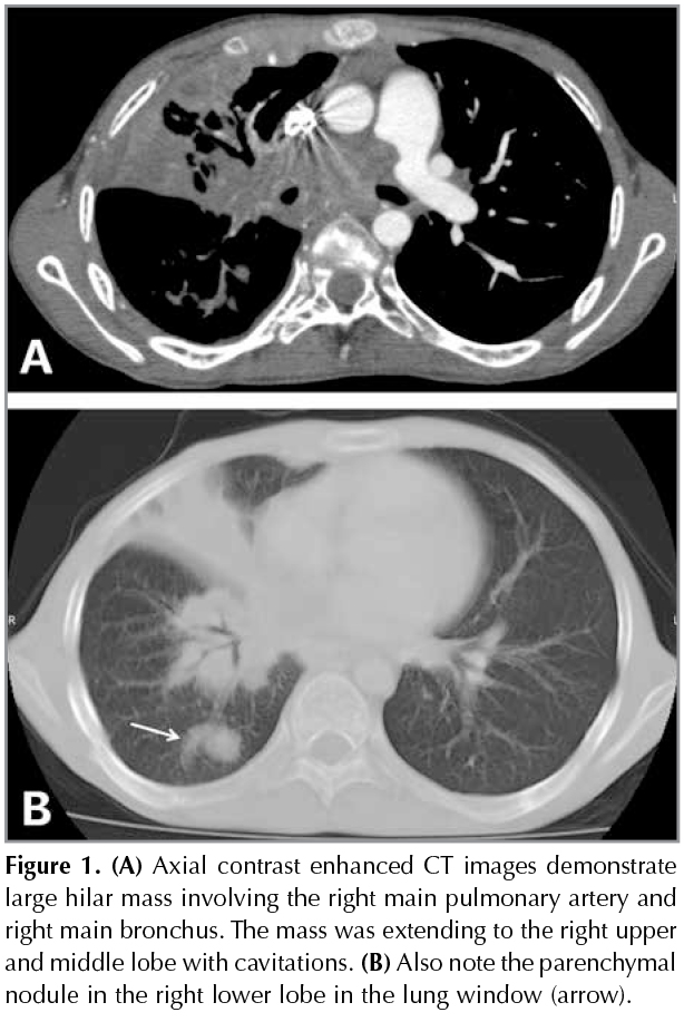 Chest radiography demonstrated mass like opacity in the upper and middle lobe of right lung. Thorax computed tomography (CT) revealed an intensely enhancing large mass with necrotic characteristics in the right upper and middle lobe of the lung. The lesion was extending from the hilus to the peripheral part of the lung, mediastinum and surrounding the right main bronchus. There was a cavitary lesion in the upper lobe of the right lung and parenchymal nodules were detected in the right lung.? Also the right main pulmonary artery was obstructed with the lesion (Figure 1). Her echocardiographic evaluation revealed out no blood flow in the right main pulmonary artery due to mass effect and mild pulmonary hypertension. The abdominal ultrasonography was performed to rule out malignancy and found normal.