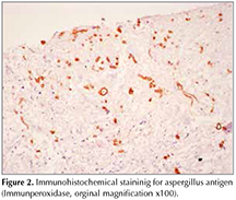 The spectrum of pulmonary aspergillosis manifestations is wide and relatively non-specific, ranging from cough, fever, malaise, fatigue, hemoptysis, shortness of breath, and unintentional weight loss (7). CNPA is among the rarest of the types, and is characterized as a slowly progressive form of pulmonary aspergillosis. The majority of CNPA cases arise as a complication of pre-existing chronic lung diseases, such as emphysema, sarcoidosis, tuberculosis sequelae, and other fibrotic lung diseases. An altered systemic immune status, such as that due to diabetes mellitus, chronic liver disease, malnutrition, connective tissue diseases, alcoholism, and low-dose corticosteroid therapy, is also considered a risk factor for CNPA (1). While immunocompromise or immunostress predisposes an individual to Aspergillus spp. infection, immunocompetent individuals are also susceptible (7). In our case, the patient had a normal immune status.