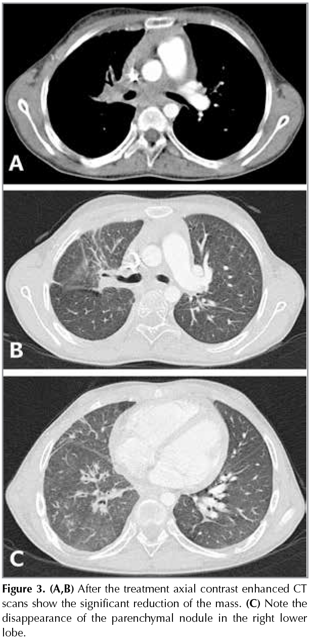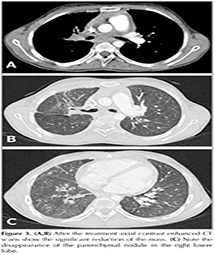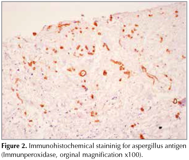 For the differential diagnosis of the mass, a CT-guided aspiration specimen was obtained from the lesional area in the right upper lobe. Biopsy specimens revealed necrotic lung tissue with septate hyphae and these necrotic zones showed positive periodic acid-schiff (PAS) staining for septate hyphae. An acid fast bacillus staining was negative. On immunohistochemical examination, these septate hyphae had positive staining with aspergillus antibodies and the remaining part of the specimen was characterized with mixed inflammation with fibroblastic and vascular proliferation (Figure 2). According to the histological findings, the diagnosis of CNPA was considered. Aspergillus specific Ig E was positive and Aspergillus galactomannan was in normal range. Immunological evaluation has been performed. C3, C4, lymphocyte subsets were in normal range, NBT test was found 100%; Ig G, Ig M, Ig E levels were elevated and tuberculin skin test was negative. The patient was immediately started on a 2-month course of intravenous voriconazole at 8 mg/kg/day divided two dosages after the loading dosage of 12 mg/kg/day for one day. Follow-up at two months the patient was discharged with orally voriconazole and reported continued general good health with no complaints. Follow up chest X-Rays revealed decreasing size of the large mass. On the third month of treatment thorax CT revealed out significant decrease on mass size (Figure 3). Medical treatment was planned to be completed at six months.