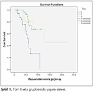 İstatistiksel analiz SPSS 21.0 paket programı (AIMS, İstanbul, T?rkiye) kullanılarak değerlendirildi. Tanımlayıcı bilgiler ortalama ? standart sapma ve sayı (%) olarak belirtildi. S?rekli değişkenler ortalama ? standart sapma ve kategorik olarak değişkenler sayı (%) olarak verildi. Değişkenlerin gruplar arasında normal dağılıp dağılmadığı Shapiro-Wilk test ile araştırıldı. Bağımsız grup karşılaştırmalarında, parametrik test varsayımları sağlandığında Student's T testi; parametrik test varsayımları sağlanmadığında ise Mann-Whitney U testi kullanıldı. Kategorik değişkenlerin saptanmasında ki-kare testi kullanıldı. Gruplar arasındaki mortalite oranları belirlendi. Kaplan-Meier y?ntemiyle sağkalım analizi yapıldı. Yaşam s?resi ile ilişkili parametreler Spearman korelasyon y?ntemi ile araştırıldı. Korelasyon saptanan parametreler ve mortaliteyle ilişkili olması muhtemel klinik parametreler Logistic regresyon analizine koyularak bağımsız risk fakt?r? araştırıldı.