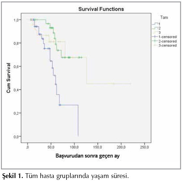 İPF tanılı hastaların 16 (%36)'sının, skleroderma tanılı hastalardan 7 (%20)'sinin ve RA tanılı hastalardan 6 (%23)'sının izlem esnasında kaybedildiği saptandı. Hasta tanı grupları arasında mortalite oranlarında anlamlı istatistiksel fark saptanmadı. Şikayet başlangıcından sonra ortalama sağkalım s?resi İPF'de 35.11 ? 22.4 ay (7-108 ay) sklerodermada 61.14 ? 27.96 ay (6-115 ay), RA'da 60.07 ? 52.18 ay (6-220 ay) idi (Şekil 1). Kaplan-Meier Survi analizinde; İPF tanılı hastalarda median sağkalım s?resi skleroderma ve RA hastalarına g?re daha kısaydı (p= 0.001, p= 0.016). T?m olgular birlikte değerlendirildiğinde mortalite, > 60 yaş (24/64 vs. 5/40, p= 0.007), KOAH (5/7 vs. 24/97, p= 0.017), refl? (7/13 vs. 22/91 p= 0.043), OİP paterni (11/48 vs. 18/56, p= 0.054), başvuruda d?ş?k PaO2 (< 60 mmHG) (6/8 vs. 8/32, p= 0.014), 6DYT'de desat?rasyon (13/28 vs. 1/18, p= 0.003), birinci yılda anlamlı DLCO kaybı (6/10 vs. 4/33, p= 0.023) olanlarda daha fazla idi. Yaşam s?resi ile yaş (r= -0.318, p= 0.001), başvuru sırasındaki PAO2 (r= 0.489, p= 0.001), anlamlı desat?rasyon varlığı (r= 0.434, p= 0.003) ve yıllık DLCO kaybı (r= 324, p= 0.023) arasında korelasyon saptandı. Mortalite ile ilişkili bulunan parametreler ve başvuru sırasındaki fonksiyonel parametreler (FVC, DLCO, 6DYM) regresyon analizine koyulduğunda t?m grupta 6DYM ve KOAH varlığı mortaliteyi bağımsız etkileyen fakt?rler olarak saptandı (p= 0.013, p= 0.02). Sadece İPF olguları değerlendirildiğinde mortalite ile yaş (r= 0.328, p= 0.03) ve OİP paterni arasında (r= 0.344, p= 0.022) korelasyon saptandı. İPF'li hastalarda radyolojik olarak OİP paterni olan 29 hastadan 14 (%48.3)'?n?n, olası OİP veya OİP dışı radyolojik paterni olan 15 hastadan 2 (%13.3)'sinin kaybedildiği saptandı. Mortalite varlığı ile korelasyon g?steren parametreler ve başvuru sırasındaki fonksiyonel parametreler (FVC, DLCO, 6DYM, PaO2) regresyon analizine koyulduğunda İPF olgularında 6DYM mortaliteyi bağımsız etkileyen tek fakt?rd? (p= 0.039). Skleroderma grubunda ileri yaş, tanı anı FVC (%) ve DLCO (%), birinci yıl anlamlı FVC (%) ve DLCO (%) kaybı, 6DYM ve tanı anı PaO2 d?zeyi ile mortalite arasında ilişki saptandı. Skleroderma grubunda da 6DYM mortaliteyi bağımsız olarak etkileyen tek fakt?rd? (p= 0.013). RA grubunda ileri yaş, tanı anı FVC (%), birinci yıl anlamlı FVC (%) kaybı, tanı anı DLCO (%), PaO2 ve 6DYM mortalite ile ilişkili saptandı. RA grubunda da 6DYM mortaliteyi bağımsız olarak etkileyen tek fakt?r olarak saptandı (p= 0.013).