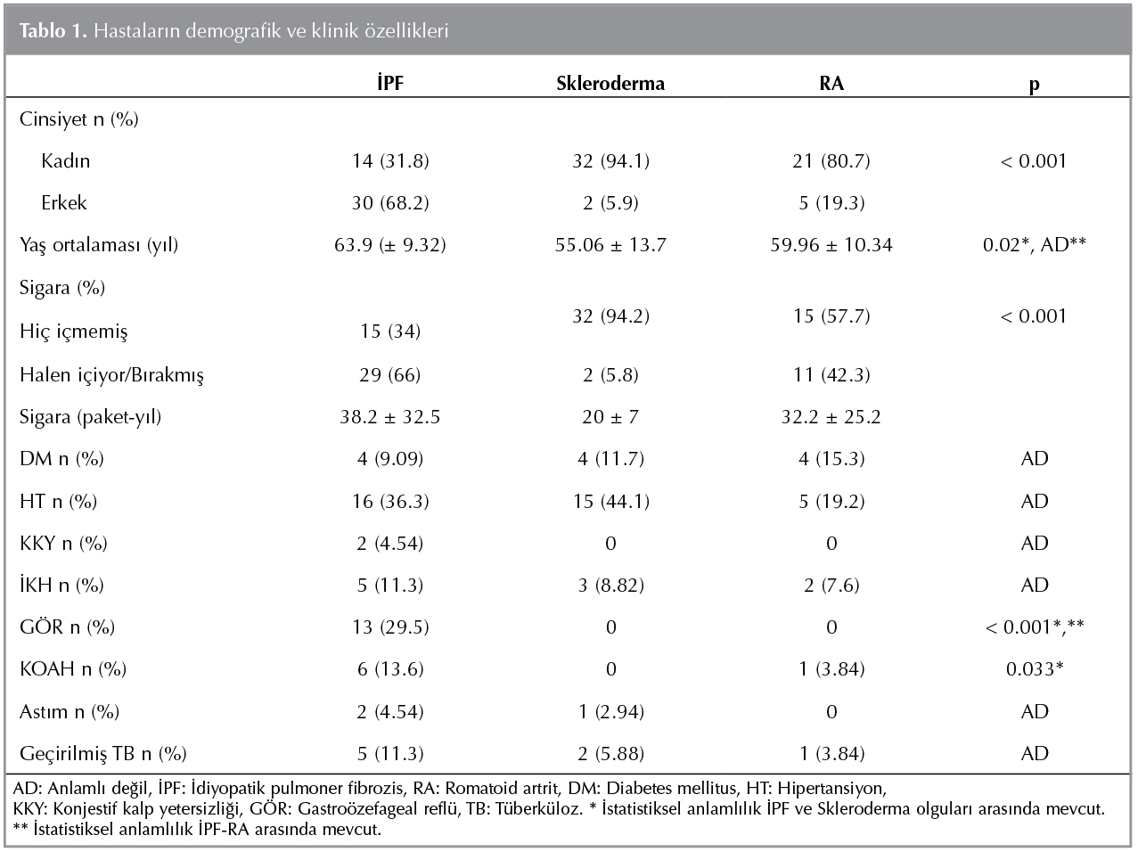İPF tanılı 44 olgu, skleroderma akciğer tutulumu olan 34 olgu ve RA akciğer tutulumu olan 26 olgu olmak ?zere toplam 104 hasta ?alışmaya alındı. İPF olgularının ?oğunluğu erkek iken skleroderma ve RA olguları ?oğunlukla kadın idi (p< 0.001) (Tablo 1). İPF'li hasta grubunun? yaş ortalaması skleroderma tanılı hasta grubuna g?re anlamlı olarak y?ksekti (p= 0.02). İPF'li ve RA tanılı hastaların yaş ortalamaları benzerdi (Tablo 1). İPF'li hastaların %65'inde sigara kullanım ?yk?s? varken sklerodermalı hastaların %5.8'inde, RA hastalarının %42'sinde sigara kullanım ?yk?s? mevcuttu. İPF'li hasta grubunda, KDH (skleroderma + RA) olan hasta gruplarıyla karşılaştırıldığında sigara i?me oranı daha y?ksekti (p< 0.001). İPF'li hasta grubunda 38 hastanın meslek bilgilerine ulaşıldı. Bu olguların 15'inde ?evresel veya mesleki maruziyet ş?phesi vardı. KDH olan hasta grubunda meslek bilgilerine ulaşılan 59 hastadan 8'inin ?evresel veya mesleki maruziyet ş?phesi olduğu g?r?ld?. İPF'li gruptan 33 (%75) hastada, sklerodermalı gruptan 20 (%58) hastada ve RA'lı gruptan 14 (%54) hastada bir veya birden fazla ek hastalık (diabetes mellitus (DM), hipertansiyon (HT), konjestif kalp yetmezliği (KKY), kronik obstr?ktif akciğer hastalığı (KOAH), astım, iskemik kalp hastalığı (İKH), gastro?zefageal refl? (G?R) ve ge?irilmiş t?berk?loz) saptandı. İPF'li hastaların G?R ve KOAH tanılarının sklerodermalı hastalara g?re y?ksek olduğu g?zlendi (p< 0.001, p= 0.033). Yine İPF'li hastaların G?R tanılarının RA'lı olgulara g?re anlamlı olarak fazla olduğu saptandı (p= 0.001).