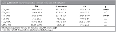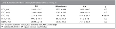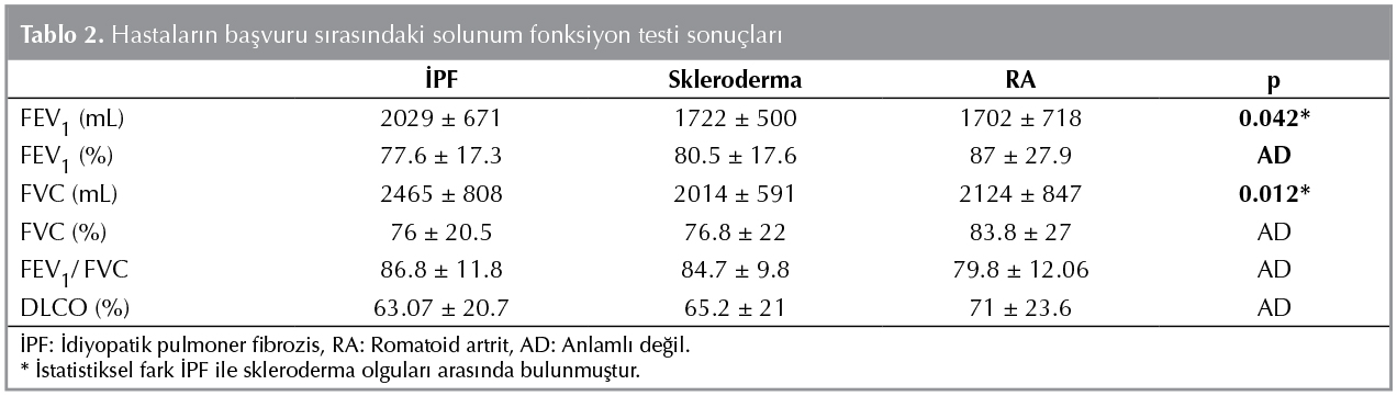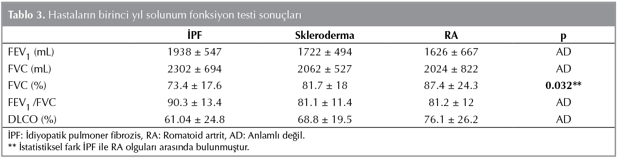 Tanı sırasında solunum fonksiyon teslerinde İPF hastalarının (n= 40); 19 (%47)'u restriktif paternde, biri (%2.5) obstr?ktif paternde ve 20 (%50)'si normal SFT sonu?larına sahipti. DLCO değerlerine ulaşılan 30 hastanın 7 (%23.3)'sinde normal, 7 (%23.3) hastada hafif derecede, 12 (%40) hastada orta derecede ve 4 (%13.3) hastada ileri derecede d?ş?k DLCO değeri olmak ?zere hastaların %76'sında d?ş?kt?. Skleroderma akciğer tutulumu olan hastaların 32'sinin SFT değerlerine ulaşıldı. Bu hastalardan 16 (%50)'sı restriktif paternde, 2 (%6.25)'si obstr?ktif paternde ve 14'? normal SFT sonu?larına sahipti. Sklerodermalı hastaların tanı anında 25'inin DLCO değerine ulaşıldı. DLCO değeri 6 (%24) hastada normal iken, 8 (%32) hastada hafif derecede, 9 (%36) hastada orta derecede, 2 (%8) hastada ise ileri derecede olmak ?zere hastaların %70'inde d?ş?kt?. RA akciğer tutulumu olan hastaların 23'?n?n SFT değerlerine ulaşıldı. Bu hastalardan 8 (%34.7)'i restriktif paternde, 3 (%13) '? obstr?ktif paternde ve 12 (%52.3)'si normal SFT sonu?larına sahipti. RA akciğer tutulumu olan hasta grubunda tanı anında 21'inin DLCO değerine ulaşıldı. DLCO değeri 8 (%38) hastada normal iken, 7 (%33.3) hastada hafif derecede, 4 (%19) hastada orta derecede, 2 (%9.5) hastada ileri derecede olmak ?zere hastaların % 62'sinde d?ş?kt?. İPF'li hastaların tanı anında FEV1(mL) ve FVC (mL) değerleri skleroderma tanılı hasta grubuna g?re anlamlı olarak d?ş?kt? (p= 0.042, p= 0.012) (Tablo 2). İPF'li hastaların 29'unda birinci yıl SFT sonu?larına ulaşıldı ve 11 (%37.9) hastada anlamlı FVC kaybı saptandı. Sklerodermalı hastaların 25'inde birinci yıl SFT değerlerine ulaşıldı ve 9 (%36) hastada FVC kaybı saptandı. RA'lı hastaların 16'sında birinci yıl SFT değerlerine ulaşıldı ve 4 (%25) hastada anlamlı FVC kaybı g?r?ld?. Birinci yılda FVC kaybı a?ısından hasta grupları arasında anlamlı fark saptanmadı.? İPF'li 21 hastada birinci yıl DLCO sonu?larına ulaşıldı ve 4 hastada anlamlı DLCO kaybı g?r?ld?. Skleroderma tanılı 19 hastada birinci yıl DLCO değerlerine ulaşıldı ve 2 hastada anlamlı DLCO kaybı saptandı. RA'lı 9 hastada birinci yıl DLCO değerlerine ulaşıldı ve 4 hastada anlamlı DLCO kaybı g?r?ld?. Birincin yıl anlamlı DLCO kaybı a?ısından tanı grupları arasında istatistiksel fark saptanmadı. İPF'li hastaların birinci yıl FVC (%) değerleri RA tanılı hasta grubuna g?re anlamlı olarak d?ş?k saptandı (p= 0.032) (Tablo 3).