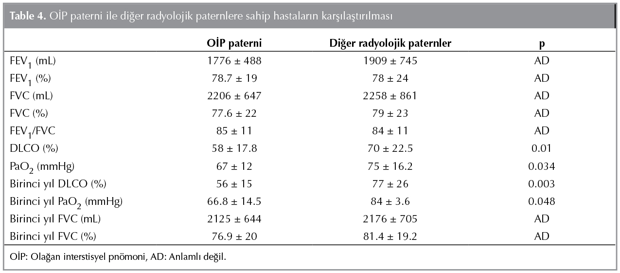 İPF'li hasta grubunda, hastaların 29 (%65.9)'u OİP paternine, 12 (%27.2)'si olası OİP paternine ve 3 (%6.8)'?? OİP dışı paterne sahipti. Skleroderma akciğer tutulumu olan hastaların 7 (%20.5)'si OİP paternine, 24 (%70.5)'? nonspesifik interstisyel pn?moni (NSİP) paternine, 3 (%8)'? diğer radyolojik g?r?n?mlere sahipti. RA akciğer tutulumu olan hastaların 8 (%30.7)'i OİP paternine, 9 (%34.6)'u NSİP paternine, 2 (%7.6)'si diğer radyolojik g?r?n?mlere ve 7 (%26.9)'si romatoid parankimal nod?l g?r?n?mlerine sahipti. T?m hasta gruplarında radyolojik OİP paterni olan olgular diğer radyolojik paterne sahip olgularla karşılaştırıldığında OİP paternine sahip olguların tanı anı DLCO (%) ve PaO2 d?zeyi, diğer radyolojik paternlere sahip hastalara g?re anlamlı olarak d?ş?k olduğu g?r?ld? (p= 0.01, p= 0.03) (Tablo 4). Ayrıca OİP paternine sahip olguların yaş ortalamaları (63.7 ? 9) diğer radyolojik paterne sahip olgulara g?re (57.3 ? 12) anlamlı olarak y?ksek bulundu (p= 0.04). OİP paterni ve diğer radyolojik paterne sahip olgular arasında hastaların diğer ?zellikleri ve akciğer vol?mleri a?ısından anlamlı fark saptanmadı.