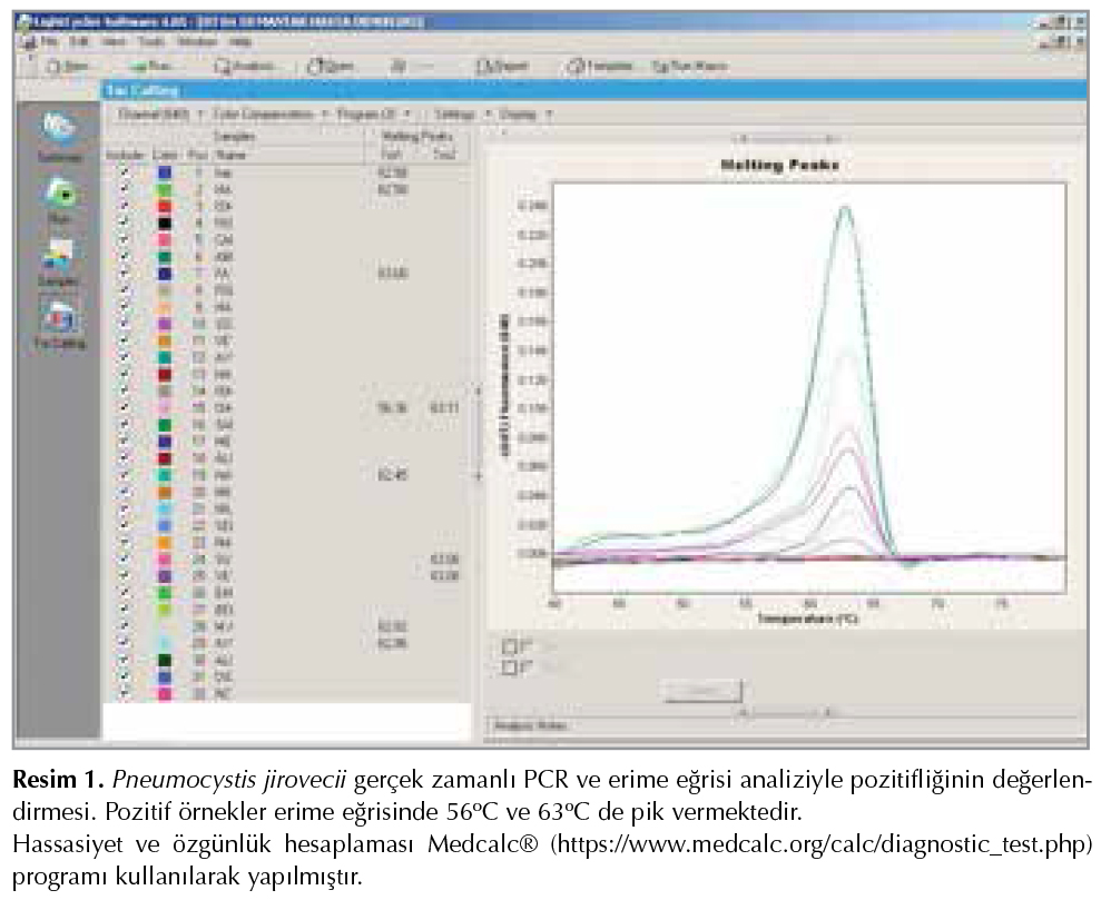Elde edilen DNA ?rneklerinden P. jirovecii varlığının saptanabilmesi i?in total hacim 10 ?l olacak şekilde 20-50 ng genomik DNA, 400 nM forward ve reverse primerler (Forward: 5'-GTAGGTATAGCACTGAATATCTCG-3', Reverse: 5'-TTTAGATATCCAACAACTTTTATTTCAC-3'), 200 nM problar (Probe1: ATAATCAGACTATGTGCGATAAGGTAGA-FL, Probe 2: LC640-CGAAAGGGAAACAGCCCAGAAC --PH), 2 mM MgCl2, 1 ?l LightCycler FastStart DNA Master Hybridisation probe (Roche Applied Science) ve 1.7 ?l PCR suyu (Roche Applied Science) ile ?rnekler hazırlanarak ger?ek zamanlı PCR'yi, LightCycler 2.0 (Roche Applied Science; Mannheim, Germany) cihazında ger?ekleştirilmiştir. Olgulara ait sonu?lar, analiz sonucunda elde edilen erime eğrisi pik derecelerine g?re pozitif ve negatif olarak belirlenmiştir. Erime eğrisi analizi Kanal 2' den ger?ekleştirilmiştir. Erime eğrisinde pozitif ?rnekler 56?C ile 63?C de pik vermektedir (Resim 1).