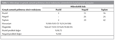 Toplam 42 hastanın (24 erkek, yaş ortalaması 31.29 ? 26.43 (min: 1-max: 85) BAL ?rneği ?alışılmıştır. On altı ?rnekte herhangi bir test y?ntemi ile pozitiflik saptanmıştır. ?? ?rnek, ger?ek zamanlı PCR ve mikroskobi ile pozitif saptanmış iken 13 ?rnek sadece ger?ek zamanlı PCR ile pozitif bulunmuştur. Mikroskopik bakı altın standart olarak alınarak PCR y?nteminin hassasiyet ve ?zg?nl?k değerleri hesaplanmıştır (Tablo 1).