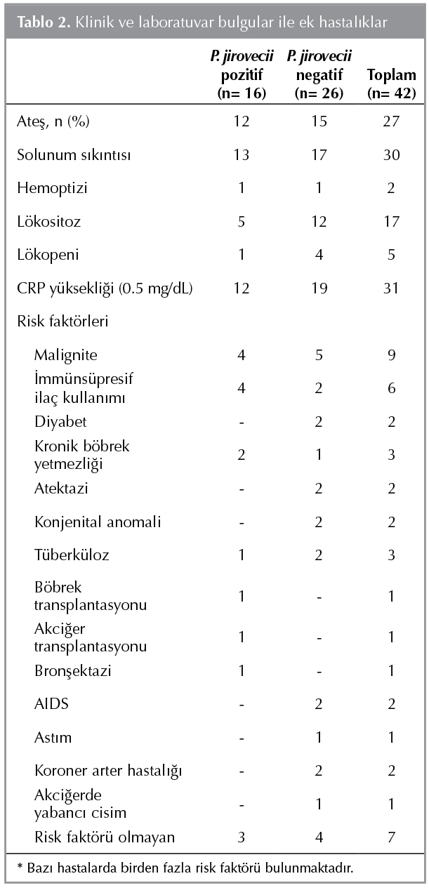 Hastaların klinik, laboratuvar bulguları, ek hastalıklar ve test sonu?ları Tablo 2'de g?sterilmiştir. Hastaların altta yatan risk fakt?rleri incelendiğinde en sık malignite ve romatolojik hastalığa bağlı imm?ns?presan ila? kullanımı saptanmıştır.