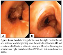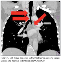 A 35-year-old male patient consulted at our clinic with symptoms of dyspnea, hoarseness and tinnitus that started following an episode of near-drowning 19 years ago. He also had a history of respiratory arrest subsequent to a laryngeal biopsy 13 years ago, tracheostomy, several vocal cord biopsies for hoarseness (reported as inflammation), laryngeal dilation (seven times) and intermittent steroid use (longest time 1 year) for laryngeal problems. Physical examination revealed a tracheostomy scar on the cervical region and extensive keloid-like skin lesions on his entire body. Chest CT reported a lesion in the right vocal cord and a mass obliterating the left main bronchus. An endobronchial lesion at entrance of the left main bronchus was seen in fiberoptic bronchoscopy (FOB); biopsy results revealed the presence of inflammation. The patient was thus referred to our clinic for further diagnosis and evaluation of endobronchial treatment. 3D chest CT revealed heterogeneous soft tissue densities extending from the right paratracheal region to the carinal level. This manifested as irregularities and nodular indentations in the tracheal lumen which were causing the narrowing of the trachea (Figure 1).