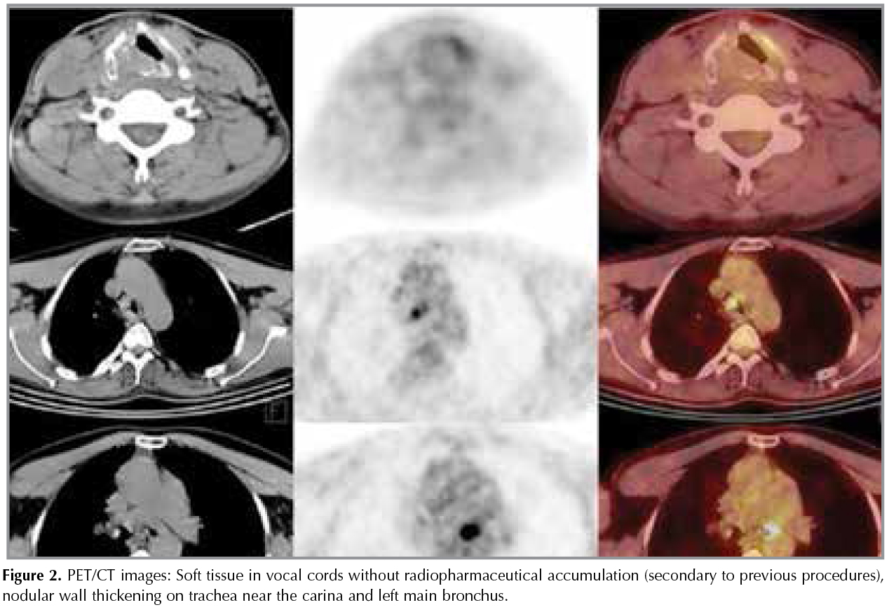 Conductive hearing loss was discovered when the patient was referred to an ear-nose-throat specialist for tinnitus. Echocardiography revealed a 2nd-3rd degree aortic regurgitation. With these clinical and radiology findings, a PET/CT scan, for probing the relapsing polychondritis, was considered to be imperative to the situation. PET/CT analysis revealed presence of soft tissue extending from the larynx to the right vocal cord along with thickening on the right lateral and anterior walls of the trachea till as far as the carina. This was causing constriction of the air column (SUVmax: 4, 25). Wall thickening on the left and right main bronchus was causing obliteration (SUVmax: 7, 53)(Figure 2).