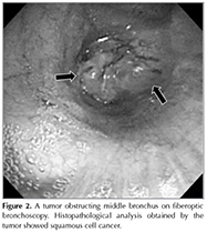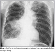 A mass was detected in a 64-year-old man with haemodialysis independent renal impairment undergoing a routine chest X-Ray (Figure 1). Thirteen years ago, the patient had renal biopsy for the correct diagnosis of nephrotic syndrome, and diagnosed as having IgA nephropathy. He treated the disease with prednisolone for ten years. The patient had cough and dyspnea on effort for three months. He smoked one pack-year for 25 years. Chest computed tomography revealed a mass in the right lung with ipsilateral mediastinal lymphadenopathy. There was small amount of pleural fluid in the right hemithorax, which was evaluated as a malignant pleural fluid clinically (Figure 1). Laboratory testing revealed blood ureanitrogen (BUN) 46.0 mg/dL and creatinine (Cre) 2.86 mg/dL. Histopathological analysis obtained by transbronchial biopsy showed squamous cell cancer (Figure 2). A brain computed tomography, abdominal echogram and bone scintigram revealed nodistant metastasis. Due to his impaired renal function, the patient received thoracic irradiation (2 Gy/day, total 50 Gy). He had no additional chemotherapy. On chest radiograph and CT scan three months after the initiation of chest irradiation, volume loss of the right lung due to post-irradiation change was observed, but no apparent finding of recurrence of squamous cell lung cancer was found (Figure 3). During the follow-up period, the patient developed pneumonia twice and herpes zoster in his left back. At these times, his renal function was tentatively deteriorated with BUN 83.0 mg/dL and Cre 5.35 mg/dlL. Fortunately, however, his renal function unexpectedly returned to the revel with BUN 25.0 mg/dL and Cre 2.07 mg/dL 15 months after the thoracic irradiation for the tumor. The patient is now followed up in our outpatient office.